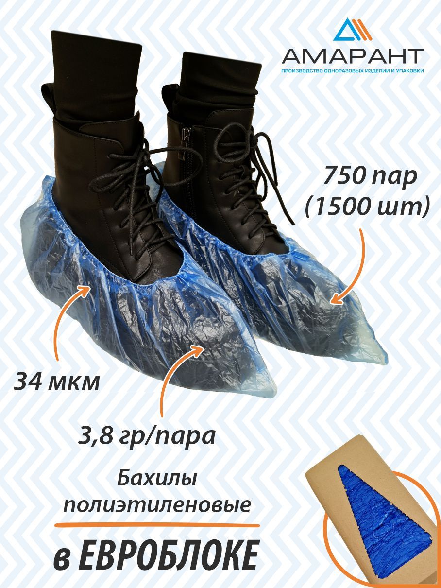 В евроблоке 750 пар (1500 шт.). Плотность бахилы с подошвой 34 мкм. Цвет синий.