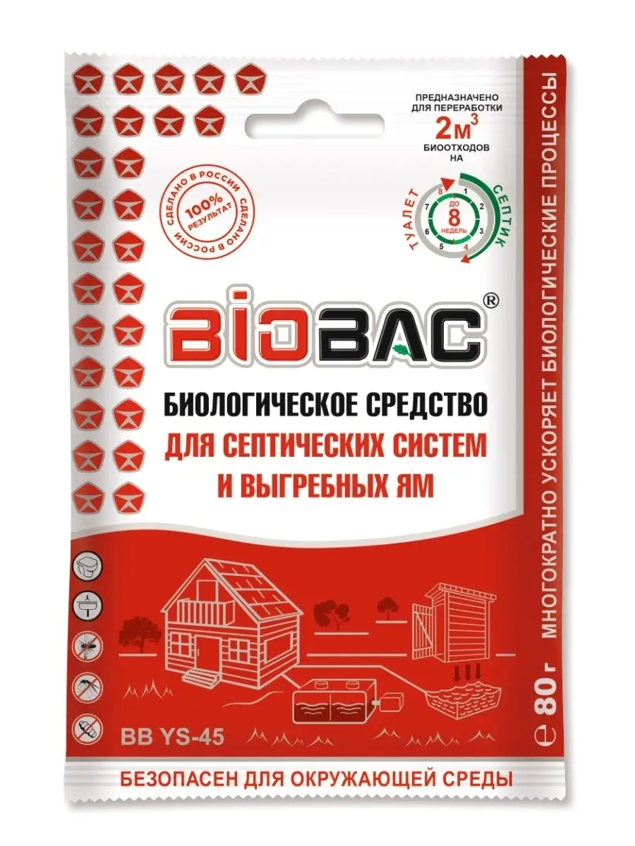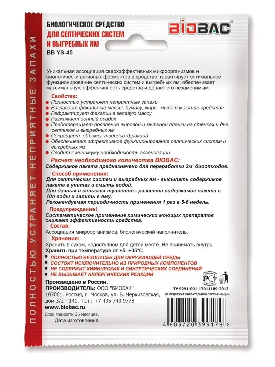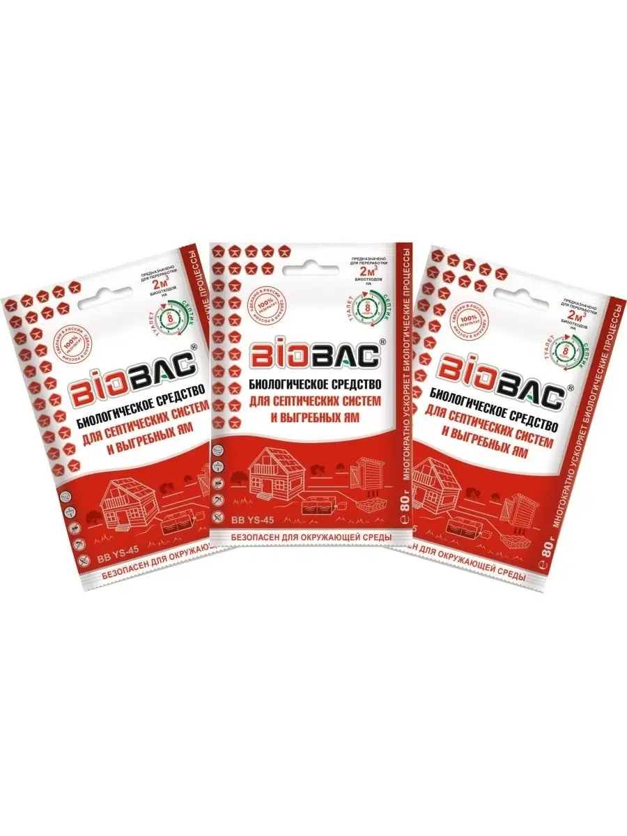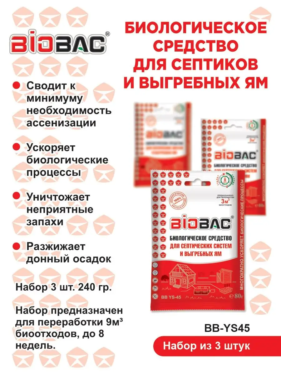 Описание: Бактерии для септика BIOBAC BB-YS45, комплект из 3 шт. Биологическое средство для выгребных ям полностью устраняет неприятные запахи, разлагает фекальные массы, жиры, бумагу, мыло и моющие средства, рефрактирует фекалии в гелевую массу, разжижает донный осадок, предотвращает появление жировой и мыльной пленки на стенках и дне септиков и выгребных ям. Сокращает объемы твердых фракций, обеспечивает эффективное функционирование септических систем и выгребных ям сводит к минимуму необходимость ассенизации. Препятствует развитию личинок насекомых. Симбиоз сверхэффективных микроорганизмов и биологически активных ферментов в средстве гарантирует оптимальную работу септика и выгребной ямы. Уникальная биологическая формула аэробных, анаэробных микроорганизмов, минеральных солей и биологически активных ферментов обеспечивает максимальную эффективность средства. Вес одного пакетика ВВYS45 80 гр, содержимое рассчитано на переработку 2 куб м биоотходов, до 8 недель. На странице нашего магазина BIOBAC БИОБАК еще больше средств для дома, для дачи и сада, средств для удаления запаха, средств для септика. Септик и средства для них, септики для туалета, септик для туалета, септик для дачного туалета, септик для выгребных ям, средство для септика, бактерии для септика, активные бактерии для туалета.