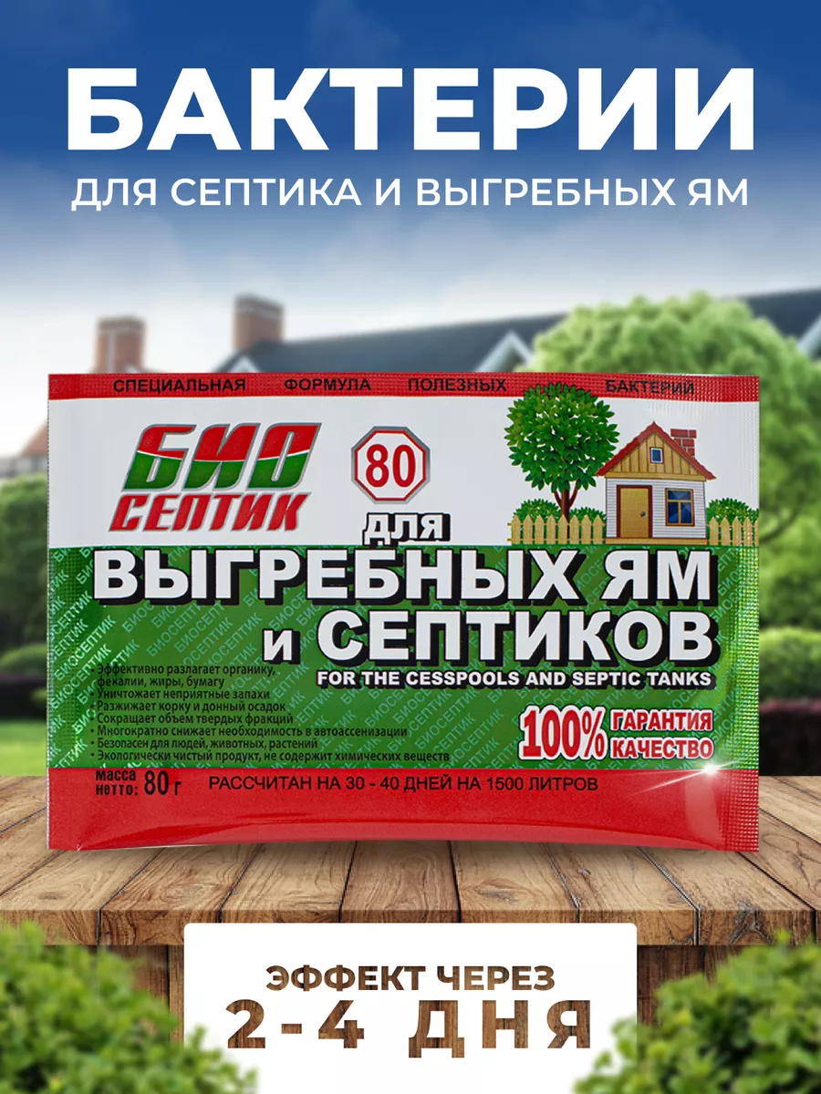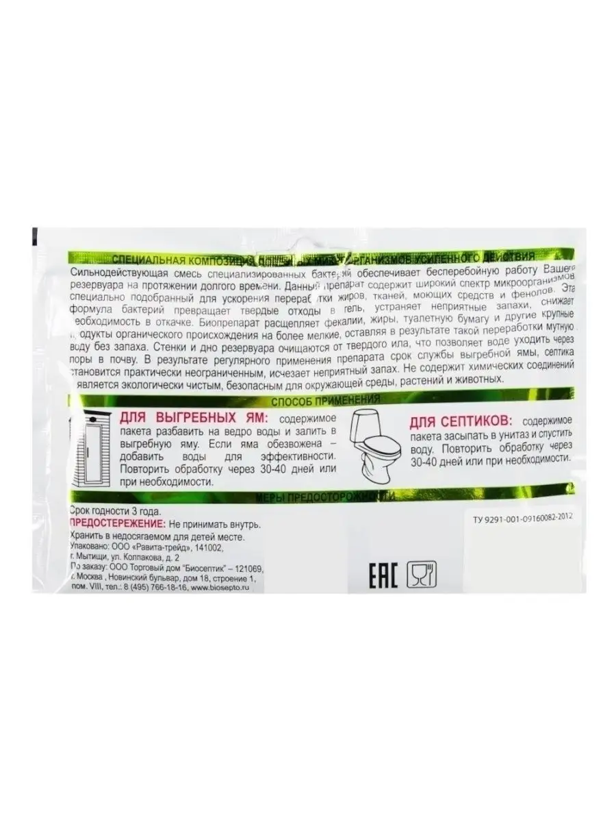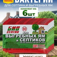 Описание: Биосептик порошок представляет собой уникальную культуру полезных бактерий для выгребных ям и септиков. Благодаря активной жизнедеятельности этих микроорганизмов вам обеспечена бесперебойная работа резервуара на протяжении долгого времени. Биопрепарат содержит живые бактерии, которые осуществляют максимально глубокое разложение всех видов органических отходов, надежно устраняет даже самые сложные засоры, нейтрализует любые неприятные запахи. Результат работы - мутная вода без неприятного запаха, работает как доктор для септика. Регулярное применение препарата позволяет забыть о дорогостоящей периодической очистке и обслуживании резервуара, а также в разы продлить срок его безаварийной службы. Биосептик эффективно очищает стенки и дно резервуара от твердого ила, что позволяет воде уходить через поры в почву, что позволяет реже производить откачку в 2 - 5 раз. Средство работает зимой если вода в резервуаре не замерзла. Биоактиватор для дачных туалетов не содержит химических соединений и является экологически чистым, безопасным для окружающей среды, растений и животных. Дозировка: на 1,5 куб.м 1 пакетик 80 г., рассчитан на 30-40 дней. Средство для дачных туалетов работает при температуре от +4 градусов (примерная температура в резервуаре в зимний период, при условии, что ими регулярно пользуются).