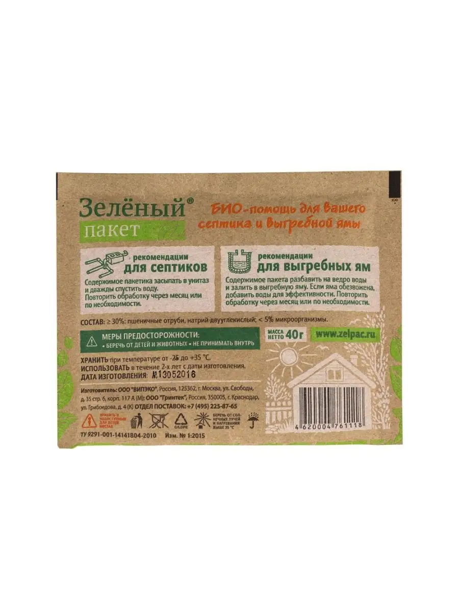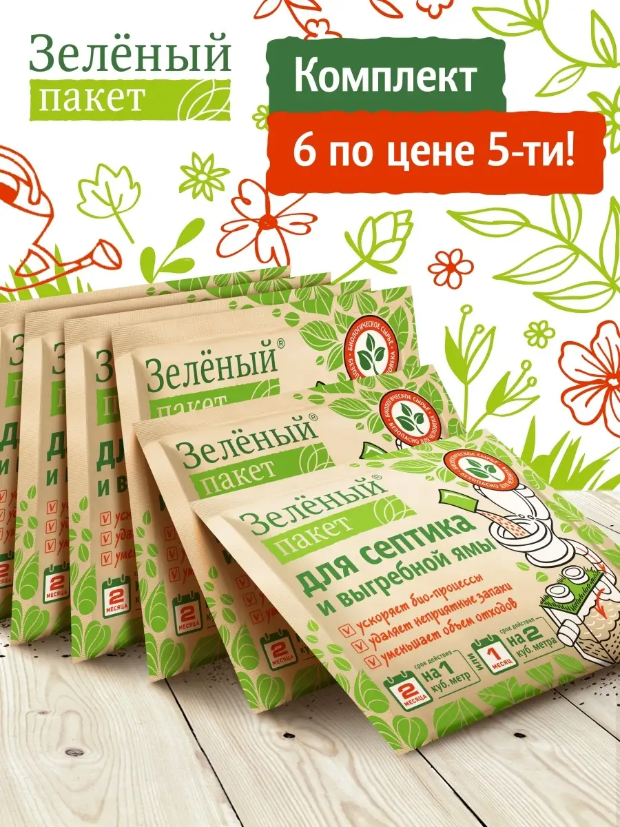 Описание: Средства для выгребных ям и септиков "Зеленый пакет" утилизирует жиры, белки, мочевину, туалетную бумагу. Ежемесячное использование Бактерий Зеленый Пакет 111 снизит необходимость в откачке, устранит неприятный запах. Биоактиватор абсолютно безопасен для людей, окружающей среды, растений и животных. Рекомендации по применению бактерии для септиков: содержимое пакетика засыпать в унитаз и дважды спустить воду. Повторить обработку через 1 месяц или при необходимости. Бактерии для выгребных ям: содержимое пакетика разбавить на ведро воды и залить в выгребную яму. Если яма обезвожена, добавить воды для эффективности. Повторить обработку через 1 месяц или при необходимости. Заказать комплект бактерий Зеленый Пакет - 6 шт. по выгодной цене.