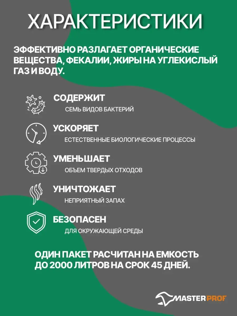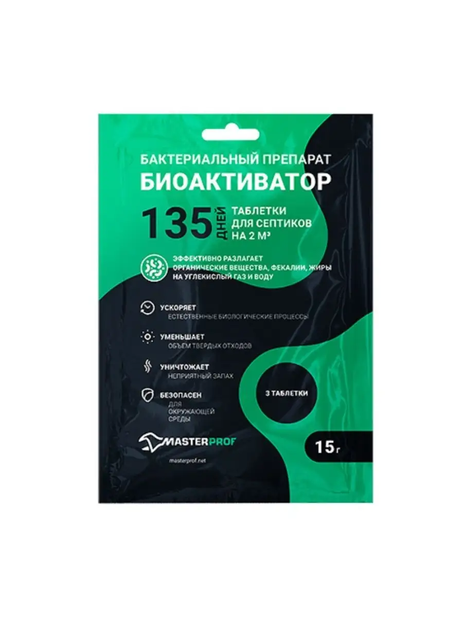 Описание: Бактериальное средство для септиков с высокой концентрацией бактерий. Биоактиватор бактерий предназначен для всех видов канализационных систем (аэробных и анаэробных). Подходит для запуска канализационных систем. Септик для туалета эффективно разлагает органические вещества, фекалии, жиры на углекислый газ и воду. Средство для выгребных ям ускоряет естественные биологические процессы, уменьшает объём твёрдых отходов. Средство для септиков содержит почвенные микроорганизмы, уничтожает неприятный запах. Бактерии для туалетов безопасны для окружающей среды. Применение: Высыпать содержимое пакета в унитаз и спустить воду (полный бачок). Продукт эффективно работает при температуре от +10 до +35 градусов. Применение дезинфицирующих средств уменьшает эффективность продукта! Одна таблетка рассчитана на емкость 2000 литров на срок до 45 дней. Продается в наборе по 1, 3 или 10 таблеток. / живые бактерии для септика септиков и выгребных ям / септик для выгребных ям дачных туалета и средства для них / Бактерии живые для септиков средство выгребных ям туалета