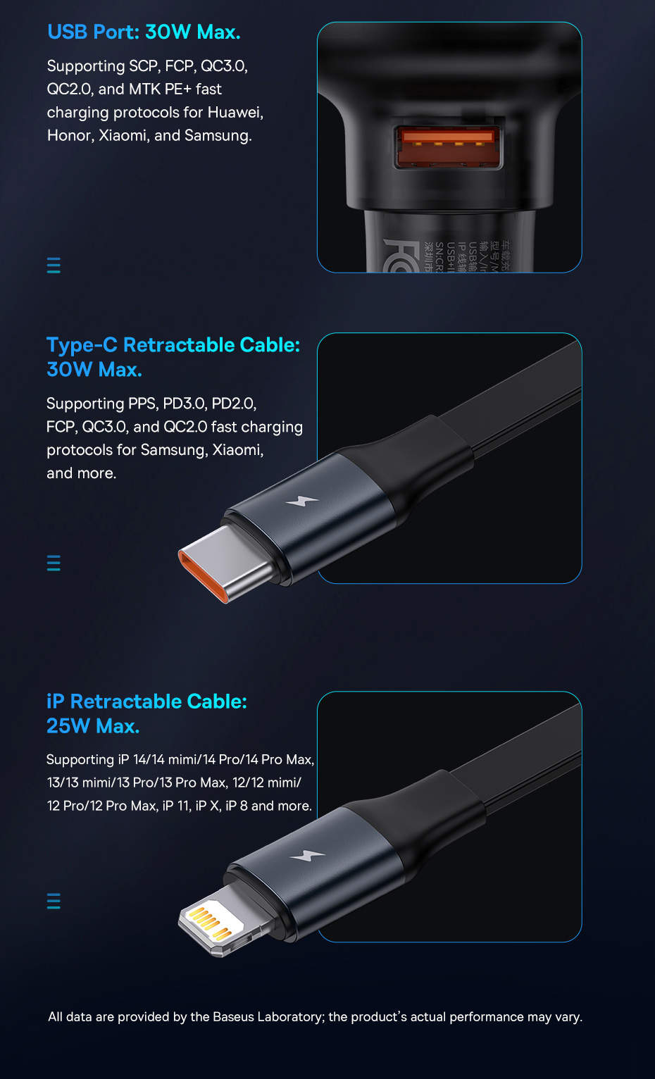 Baseus автомобильное зарядное устройство 2 в 1 30 Вт 25 Вт для MacBook Samsung Xiaomi кабель для iPhone USB C кабель для IP/Type-C Выдвижной зарядки