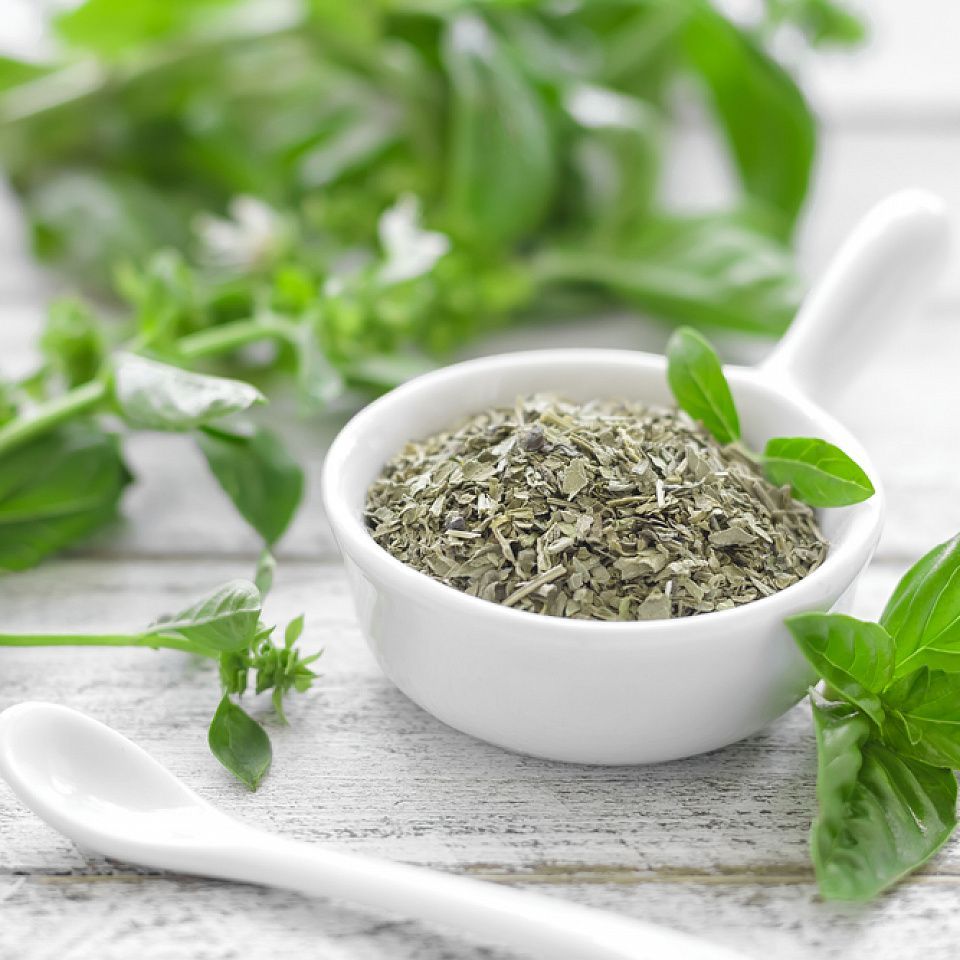 Описание: Полезные свойстваШироко используемый в кулинарии базилик, благодаря содержанию в большом количестве эфирных масел, полезных и питательных элементов, обладает следующими полезными свойствами. Сушеный базилик, в отличие от других пряных трав, сохраняет свои полезные свойства. По содержанию витаминов и полезных веществ он не уступает свежему варианту зелени. Более того: в сушёном виде он сохраняет свои вкусовые и ароматические качества.Применение в кулинарииБазилик сочетает в своем вкусе горьковатые нотки и терпкость. Его используют в приготовлении блюд итальянской кухни.