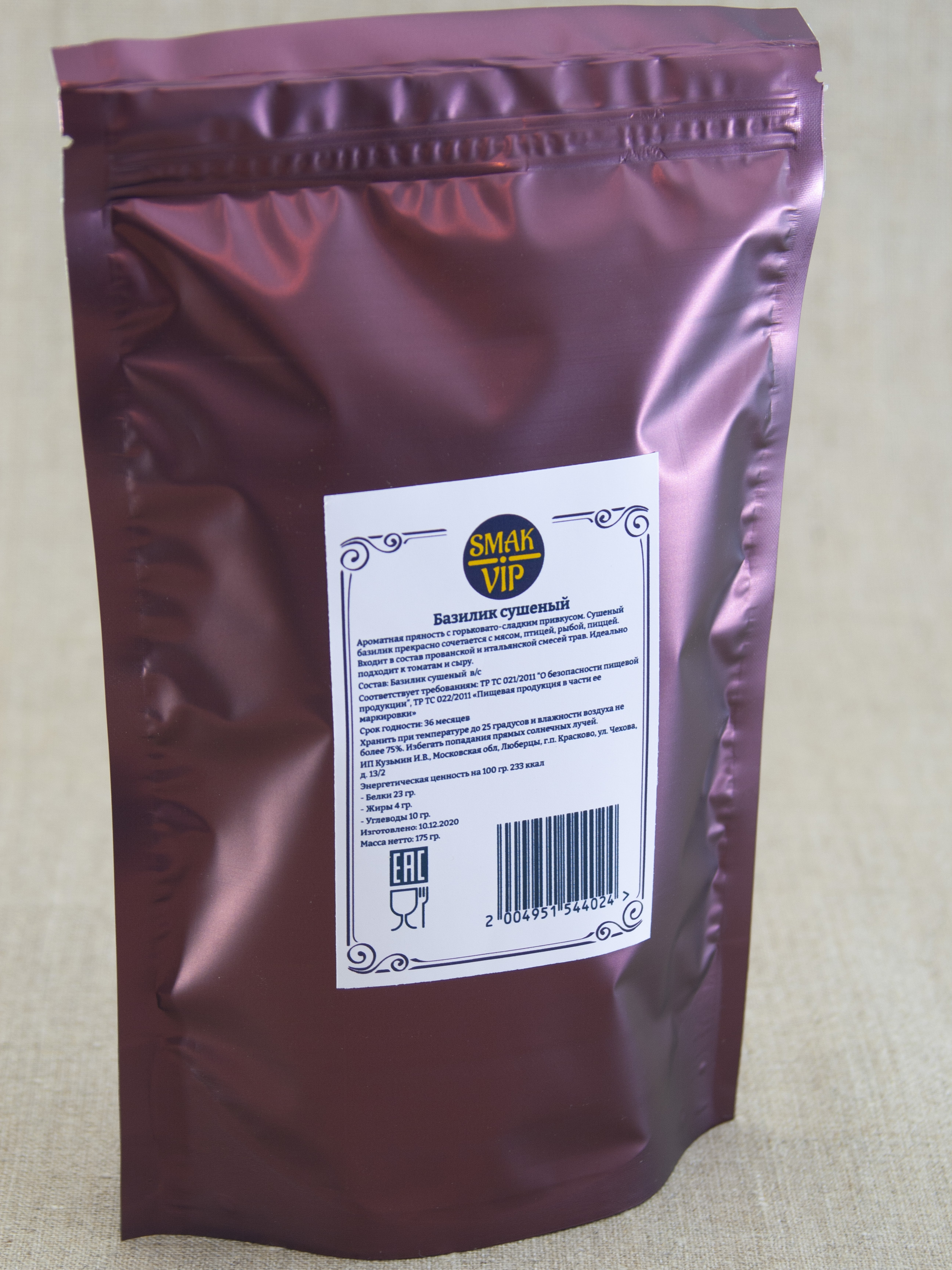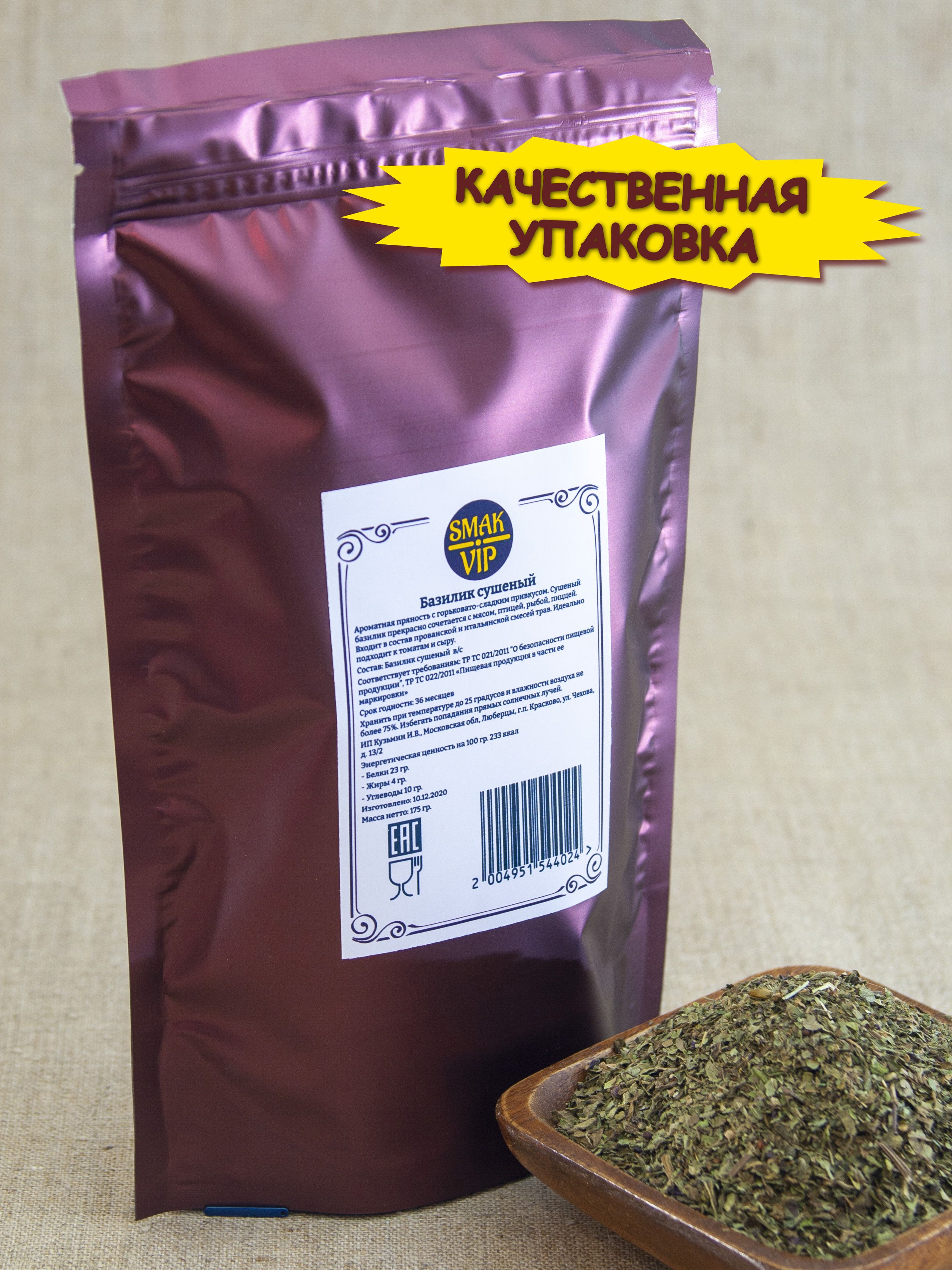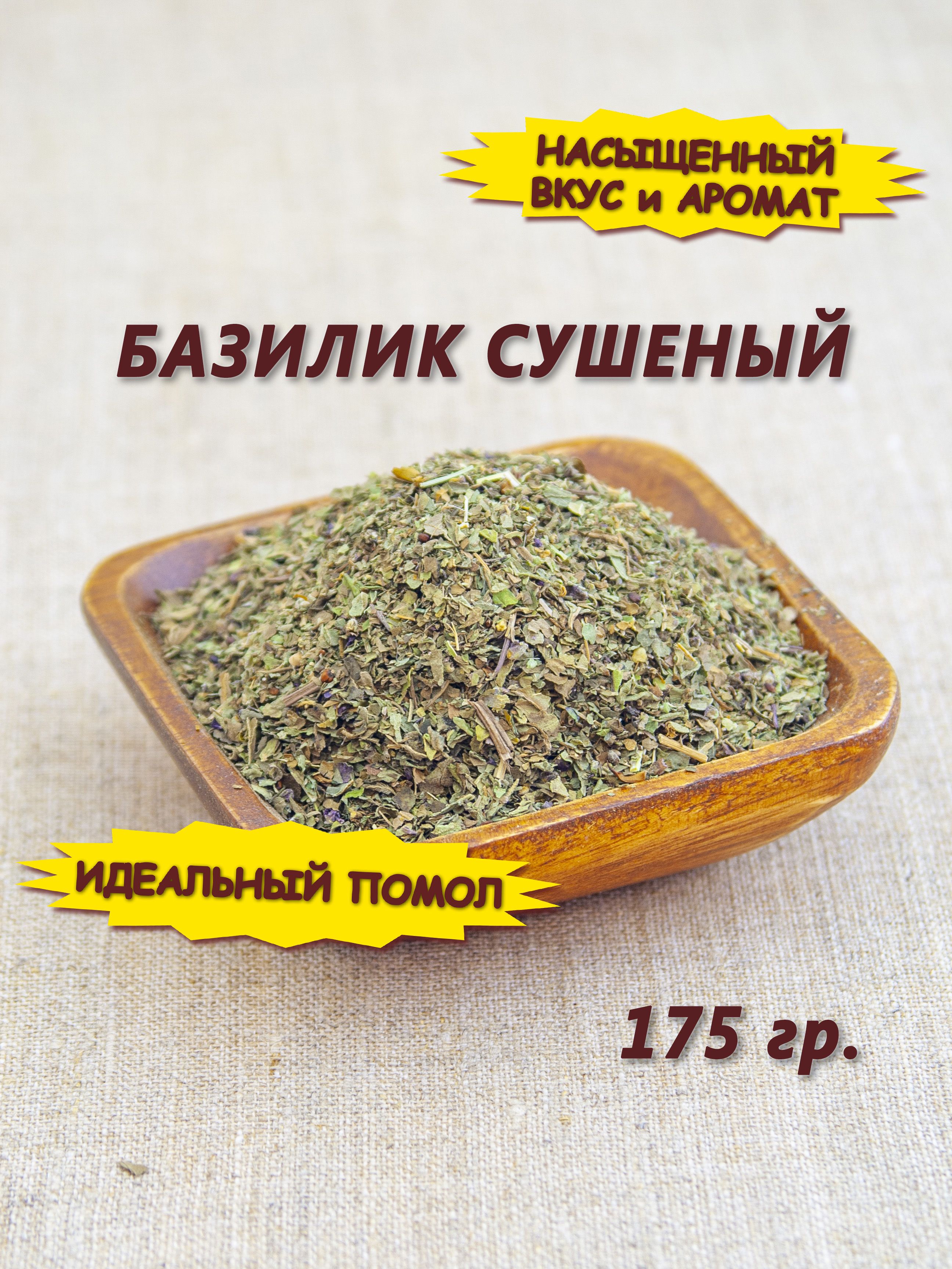 Описание: Базилик сушеный — ароматная специя, которая нашла применения во многих кухнях мира. Базилик имеет насыщенный горьковато-сладкий привкус и специфический средиземноморский аромат. Сухой базилик добавляют в мясные и рыбные, овощные блюда, десерты, супы, пиццу, спагетти, соусы и маринады. Без этой приправы немыслимы национальные блюда песто, хумус, капрезе, лазанья и продукты сыр, паприка, томаты. Базилик можно использовать для ароматизации фарша, колбас, выпечки, масла, уксуса, напитков. В сухом виде базилик сохраняет свои вкусовые качества и аромат. Пряность базилик богата фитонцидами А,В,С, РР, фитонциды, каротин, минералы калий, кальций, магний, марганец, железо, цинк. Базилик обладает антибактериальным, противогрибковым и антипаразитарным эффектом, а также нормализует работу иммунной системы, укрепляет сосуды, эффективен для женского и мужского здоровья. Сушеный базилик следует добавлять в конце приготовления и сочетать с майораном, мятой, кориандром, розмарином, орегано. Проводите кулинарные эксперименты, добавляя неповторимый базиликовый аромат в ваши блюда.
