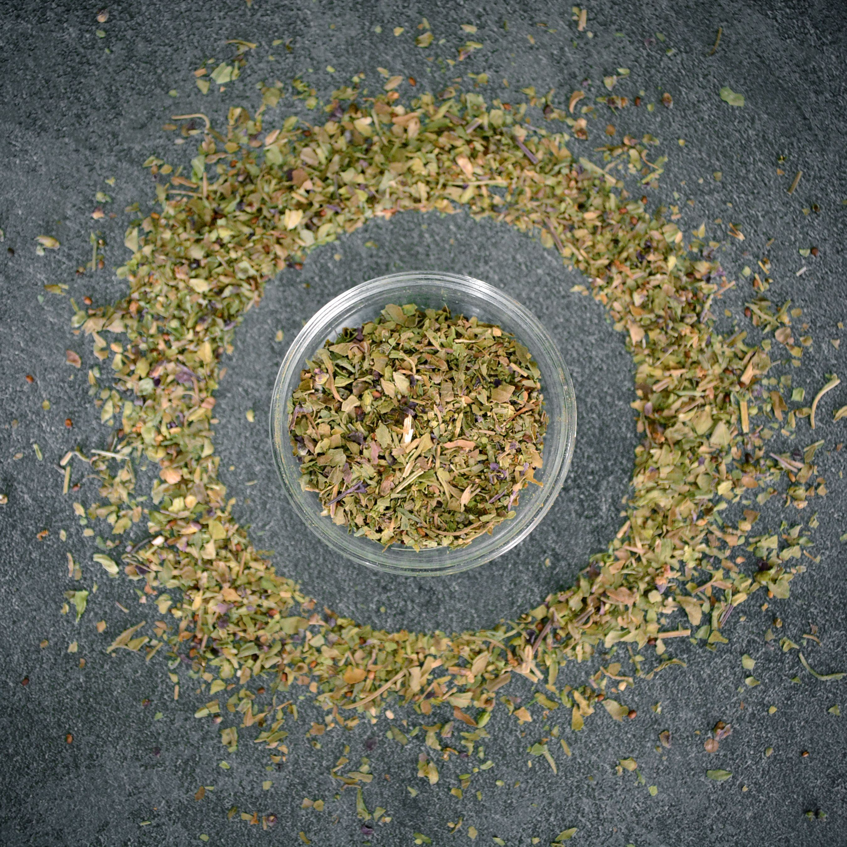 Базилик представлен в форме измельченной специи, что делает его удобным для использования в различных блюдах.