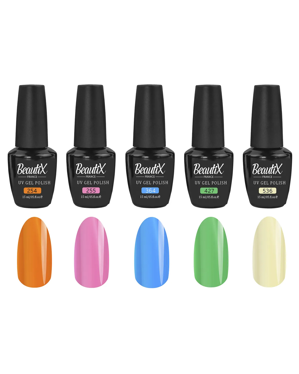 Описание: Набор из пяти цветных гель-лаков BeautiX объемом 15 мл!