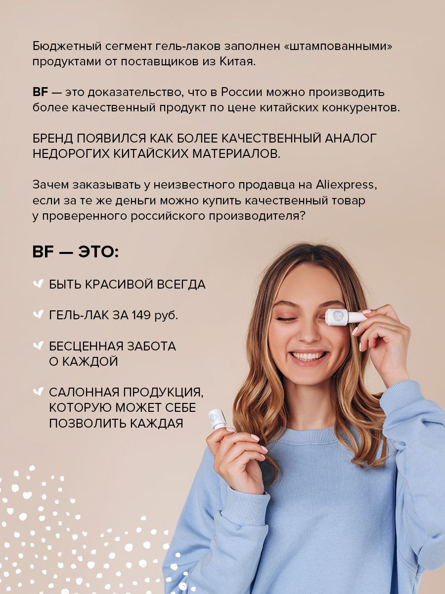 Описание: Гель-лак для ногтей обеспечивает плотное покрытие в 1-2 слоя, не полосит. Удобная средне-густая консистенция. Удобная кисточка. Покрытие сохраняет глянцевый блеск до 30-ти дней и снимается размачиванием. Носится без сколов, отслоек и трещин. Продукция BEAUTY-FREE - это альтернатива качественным, но дорогим материалам для покрытия ногтей.