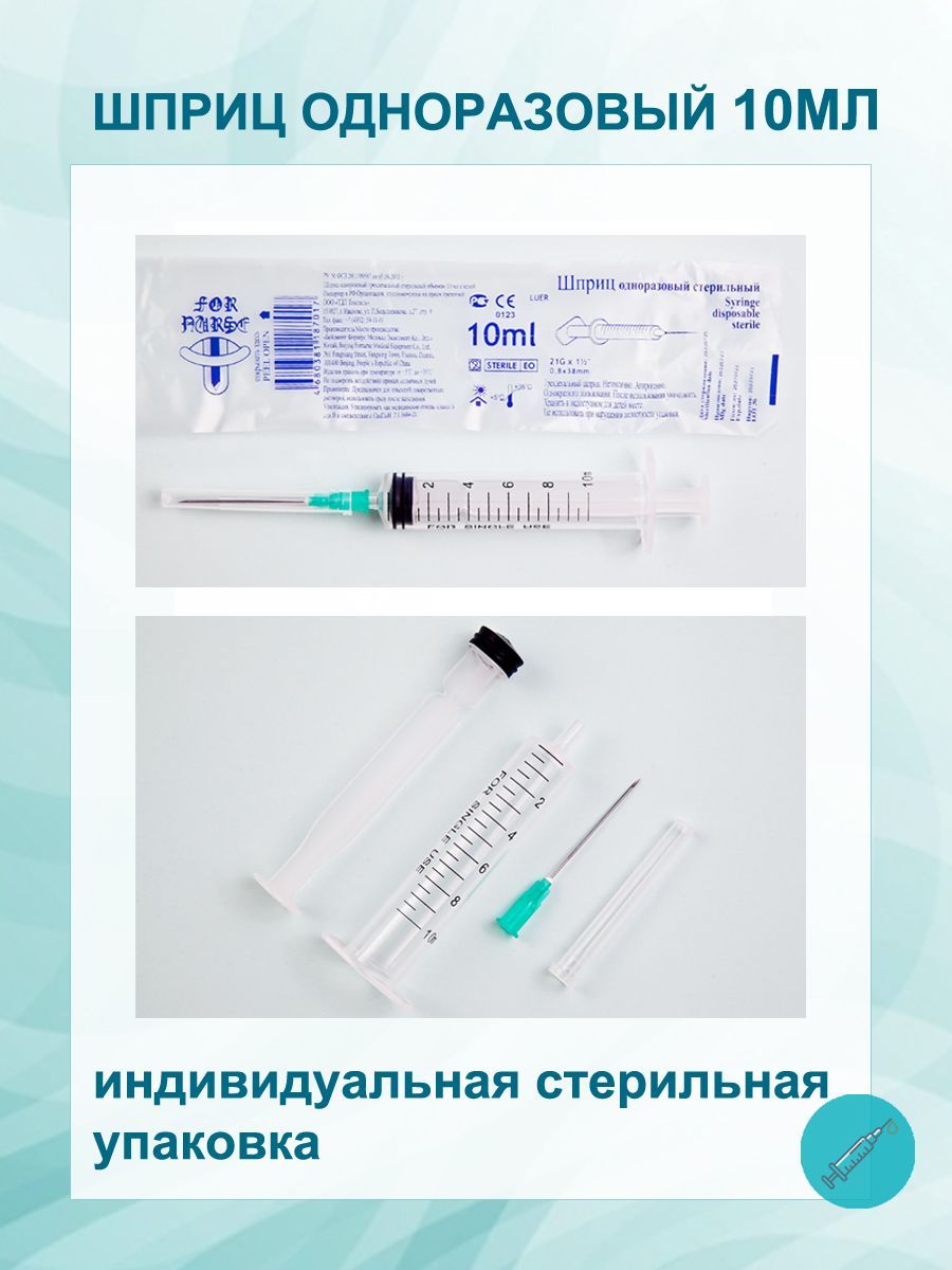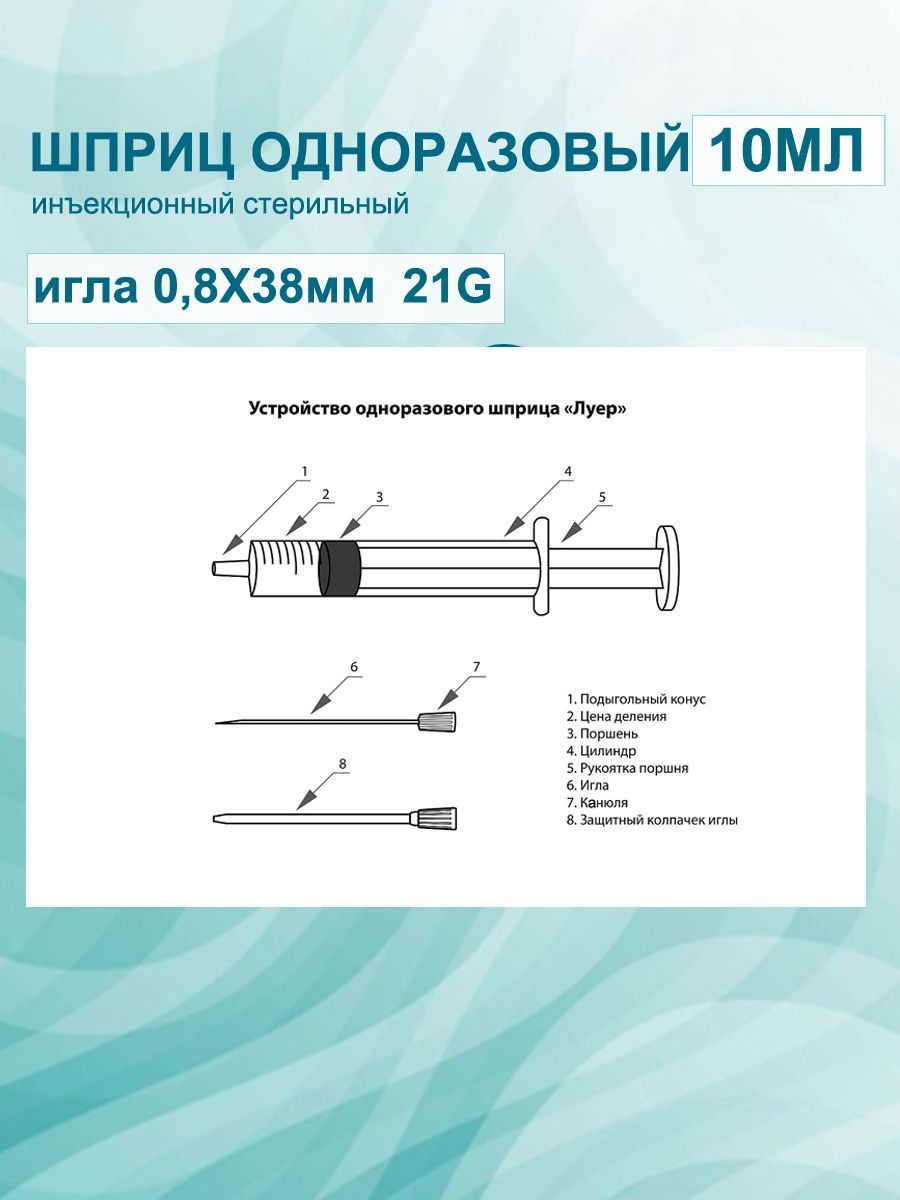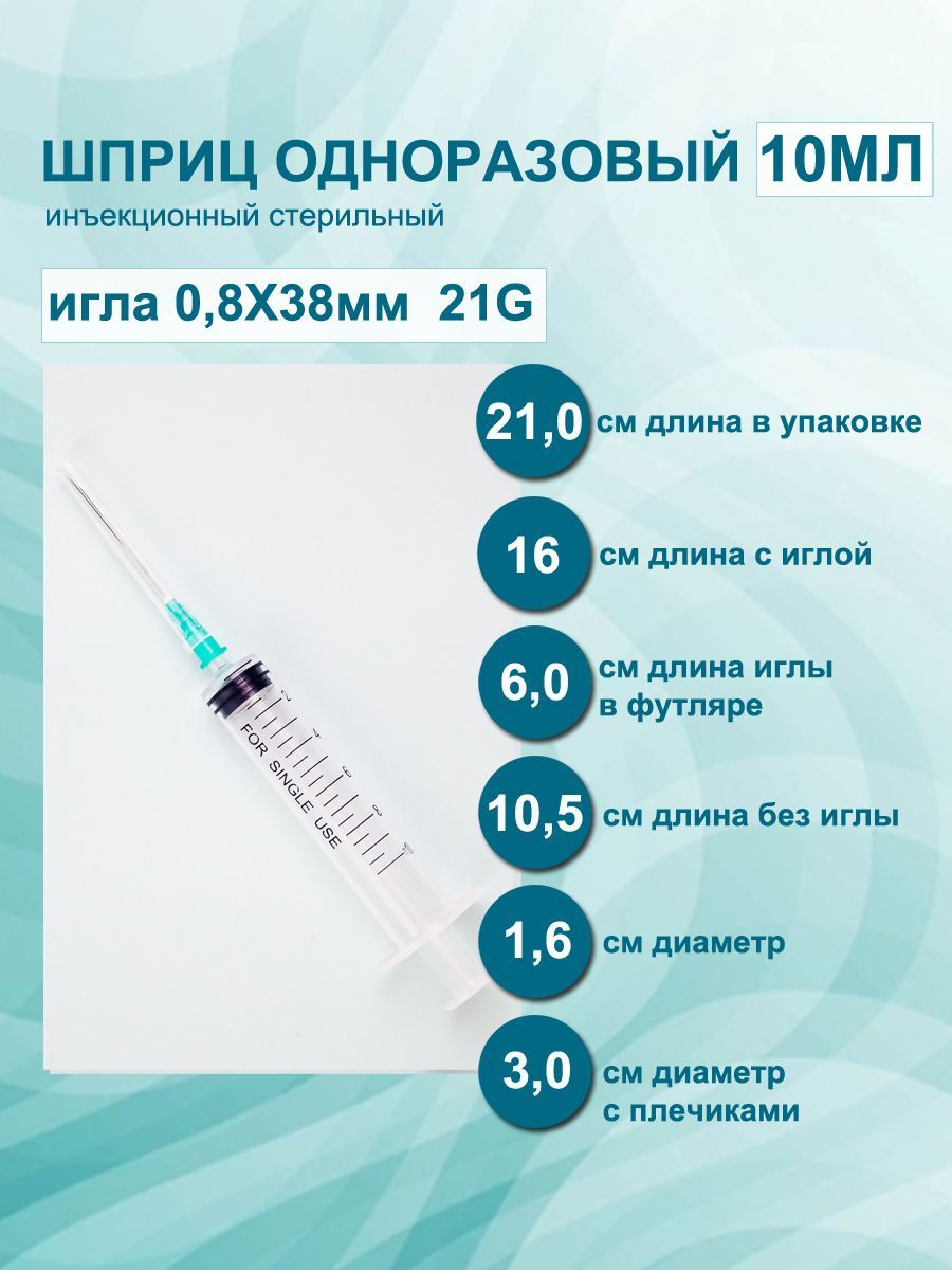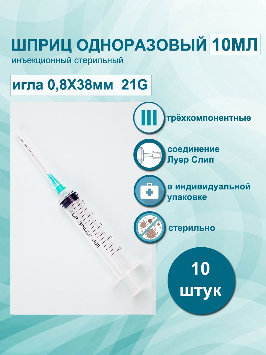Beijing / Шприц медицинский 10 мл 10шт 3-х компонентный с иглой 21G 0,8х38 мм, стерильный одноразовый для уколов