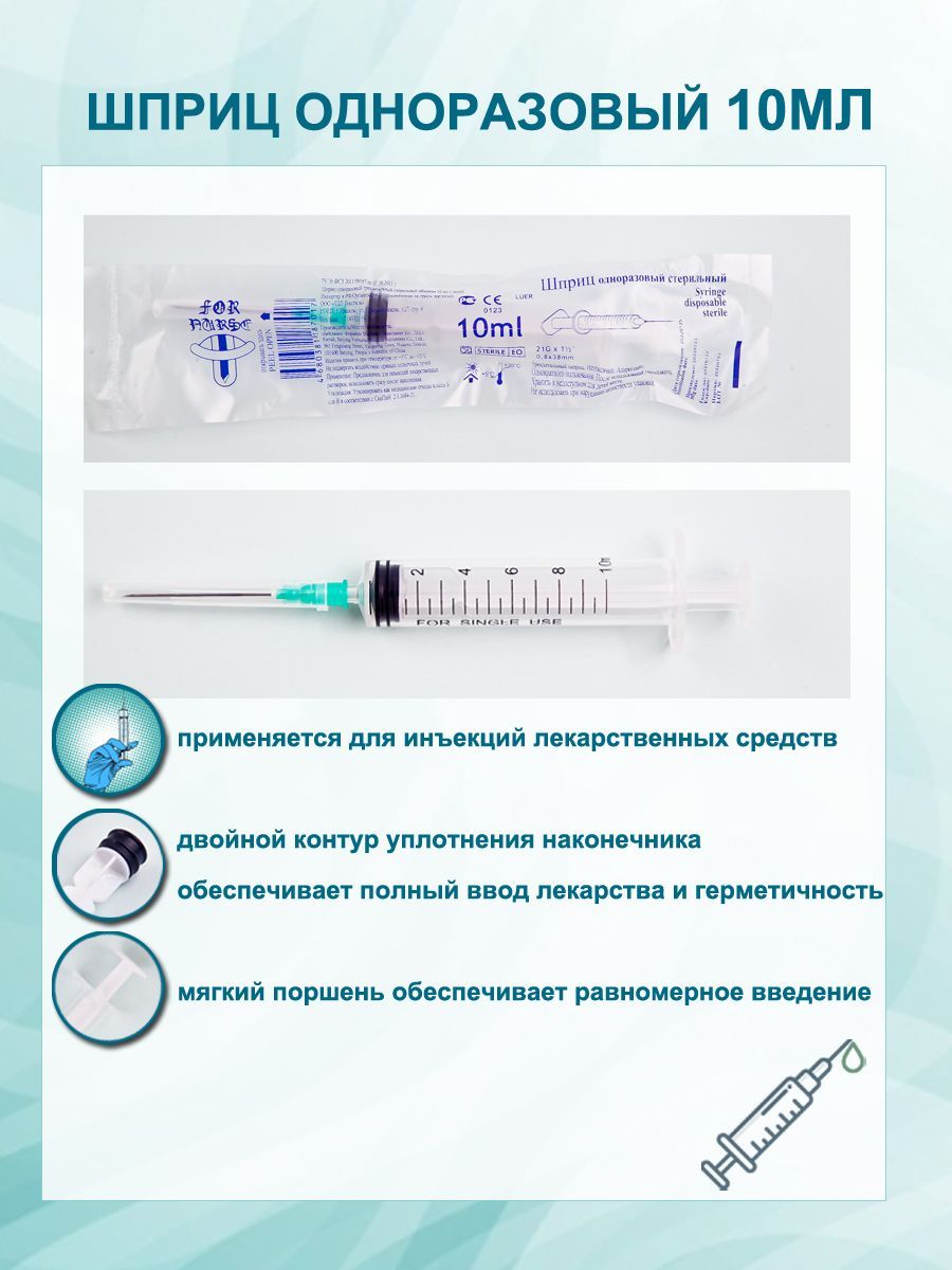Описание: Шприцы инъекционные 3-х компонентные однократного применения стерильный объемом 10 мл с наконечником концентрического типа соответствуют международному стандарту ISO 7886-1.