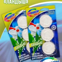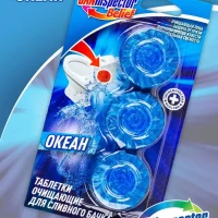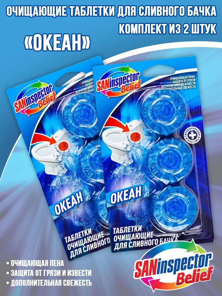 Описание: С 4-кратным сочетанием активных ингредиентов. Очищающая пена: очищает унитаз при каждом сливе воды. Формула против извести: предотвращает известковый налет. Защита от грязи: защищает от повторного загрязнения. Дополнительная свежесть: обеспечивает приятный свежий аромат. Одна очищающая таблетка для сливного бачка СанИнспектор эффективно поддерживает гигиеническую чистоту, предотвращает появление известкового налета, а также после каждого смывания придает устойчивый и свежий аромат туалетной комнате. Способ применения: 1. Не снимайте защитную пленку с таблетки СанИнспектор.2. Поместите таблетку в сливной бачок (1 таблетки хватает до 500 смывов*).3. Перед первым смывом подождите 10 минут.4. Если окрас воды пропал, используйте новую таблетку СанИнспектор. Интенсивность окрашивания воды при растворении таблетки зависит от частоты смываний, качества воды и может отличаться от интенсивности цвета таблетки до использования.