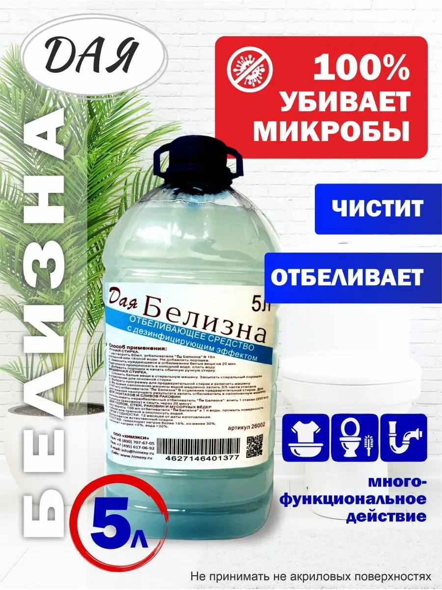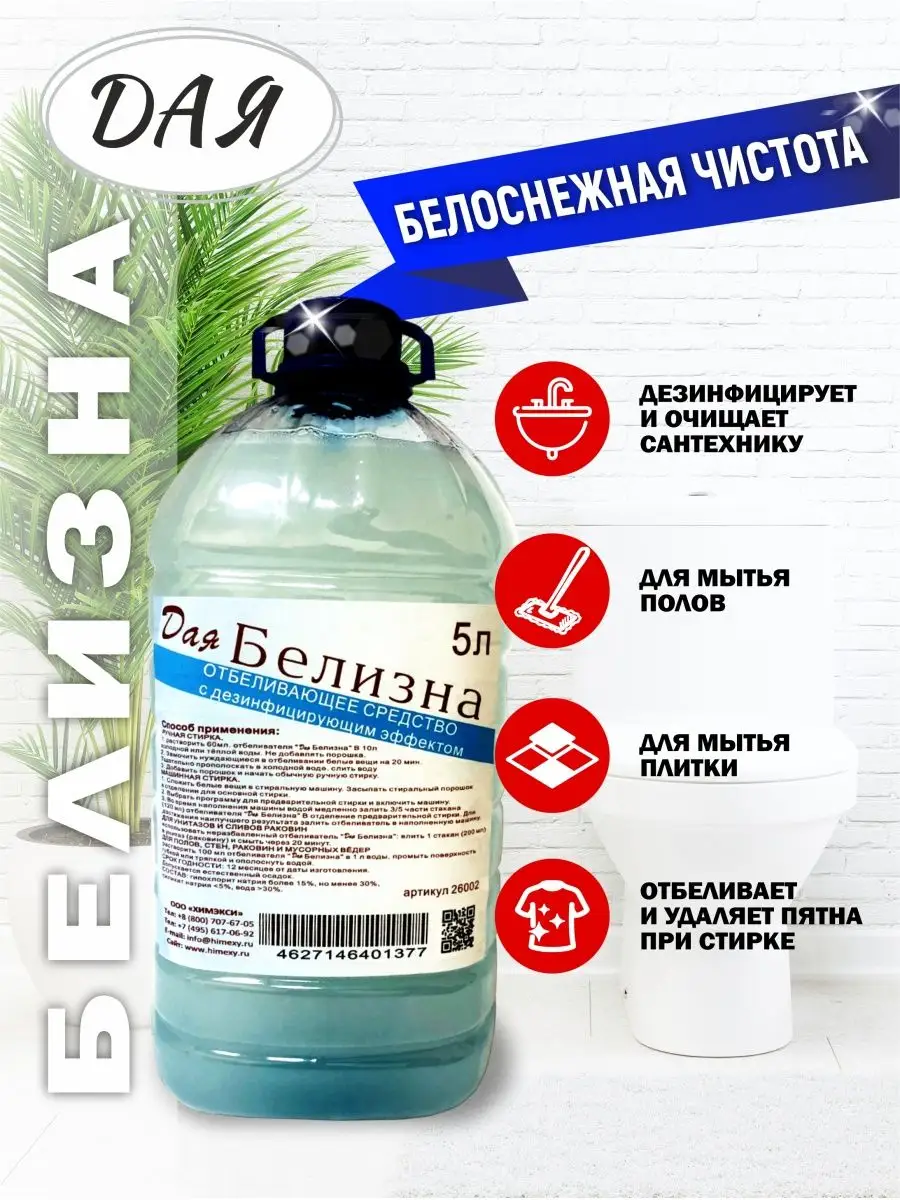 Описание: Белизна - жидкость для уборки канистра 5 литров предназначена для дезинфекции и отбеливания в процессе мытья, уборки, стирки изделий из х/б и льняных тканей, для удаления пятен и мытья эмалированной, фарфоровой, фаянсовой поверхностей, облицовочной плитки, пластика, мусорных ведер, сантехники, устранения неприятного запаха. Средство «Белизна» представляет собой водный раствор гипохлорита натрия и ПАВ. Не выделяет едкого запаха хлора, приятный аромат яблока в сочетании с дезинфицирующим действием. Жидкое моющее средство с антисептическим и противовирусным действием не предназначено для мытья поверхностей, контактирующих с пищей! При работе использовать резиновые перчатки! Для обработки всех видов сантехники: унитазов, биде, раковин, ванн и душевых - равномерно распределить жидкое моющее средство по поверхности, оставить на 2-3 минуты, смыть водой. Для труднодоступных участков в санузлах рекомендуется использовать ерши и щетки. Способы применения и концентрация рабочего хлорного раствора описаны на этикетке. Рекомендуется соблюдать инструкцию для получения оптимального результата. Массовая концентрация активного хлора не менее 3,5% Не имеет выраженного запаха хлорки, так как раствор щелочной. Упаковка подлежит переработке после использования.
