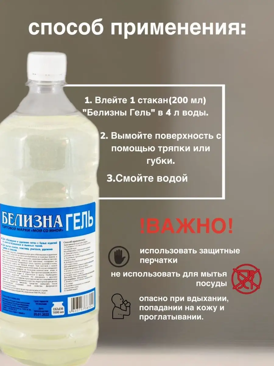 Описание: Белизна гель используется как отбеливатель, для удаления плесени и как средство против плесени и грибка. Антисептическое средство справляется с бактериями на ванне, раковине или унитазе. Благодаря регулярному применению антиржавчины, удастся в короткий срок избавиться от известкового налета. Очиститель поможет справиться с уборкой дома или после ремонта помещений. Для мытья ламината, линолеума, плитки или паркета, разведите средство водой согласно инструкции и нанесите на загрязнённую поверхность. При работе с Белизной необходимо соблюдать меры предосторожности и правила безопасности.