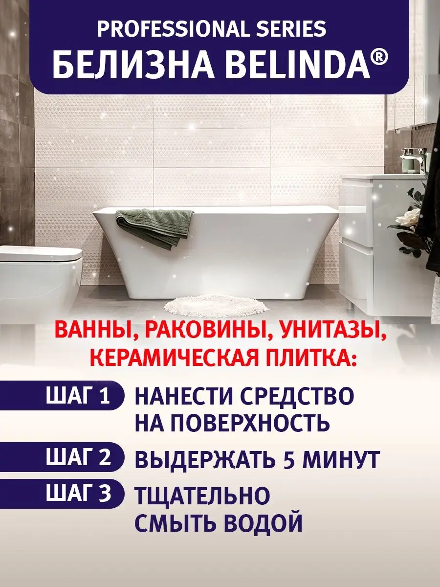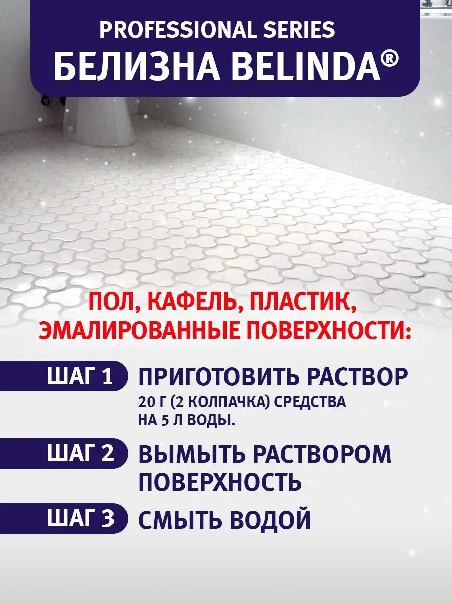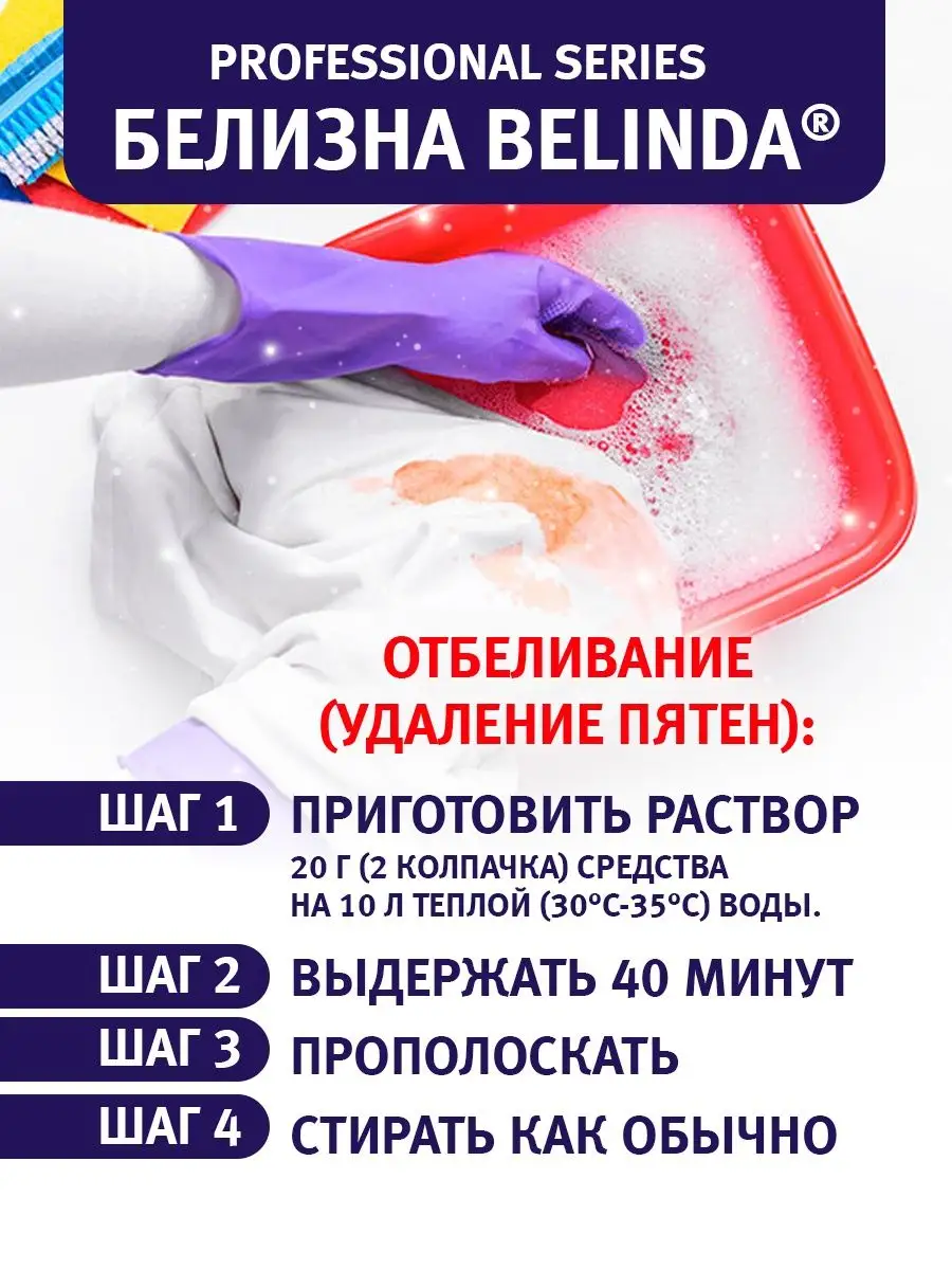 Описание: БЕЛИЗНА BELINDA® гель PROFESSIONAL SERIES- это высококонцентрированное чистящее, отбеливающее, моющее средство с дезинфицирующим эффектом. Обладает мощными отбеливающими свойствами. Высококачественный гелеобразный продукт предназначен для отбеливания хлопчатобумажных тканей, древесины, удаления пятен, для дезинфекции мест общего пользования, сантехники и труб, полов и других поверхностей, на наклонных и вертикальных поверхностях, когда необходимо продолжительное время воздействия на поверхность.ИНСТРУКЦИЯ ПО ПРИМЕНЕНИЮ - замачивание перед стиркой: приготовить раствор - 20 г (2 колпачка) средства на 10 л холодной воды. Замочить на 10 минут, прополоскать. Далее стирать как обычно.- отбеливание (наличие стойких пятен): приготовить раствор - 20 г (2 колпачка) средства на 10 л теплой (30°C-35°C) воды. Выдержать 40 минут, прополоскать. Далее стирать как обычно. - ванны, раковины, унитазы, керамическая плитка: нанести средство на поверхность, через 5 минут смыть.- для чистки стоков, уничтожения бактерий, удаления загрязнений и пятен выдержать 60 минут, смыть водой. - пол, кафель, пластик, эмалированные поверхности: мыть раствором - 20 г (2 колпачка) средства на 5 л воды. Промыть поверхность водой. МЕРЫ ПРЕДОСТОРОЖНОСТИ- Перед применением обязательно ознакомиться с инструкцией.- Использовать в хорошо проветриваемом помещении. Не вдыхать пары. При попадании средства в глаза или на кожу промыть большим количеством воды, при необходимости обратиться к врачу.- Использовать перчатки и средства для защиты лица и глаз.- Не смешивать с другими средствами во избежании опасного газа (хлора)!- Не использовать на металлических поверхностях с эмалированным, хромированным или золотым покрытием.- Не допускать попадания на ткань, мебель, обивку, ковры.- Не использовать для шерсти и шелка, а также для непрочно окрашенных тканей.- Не переливать содержимое в другие емкости.- После работы тщательно вымыть руки.- Хранить в прохладном месте, плотно закрытым, в вертикальном положении. Предохранять от попадания прямых солнечных лучей. Хранить в недоступном для детей месте.Состав: гипохлорит натрия, натрия хлорид, комплекс поверхностно -активных веществ, загуститель, отдушка, вода.
