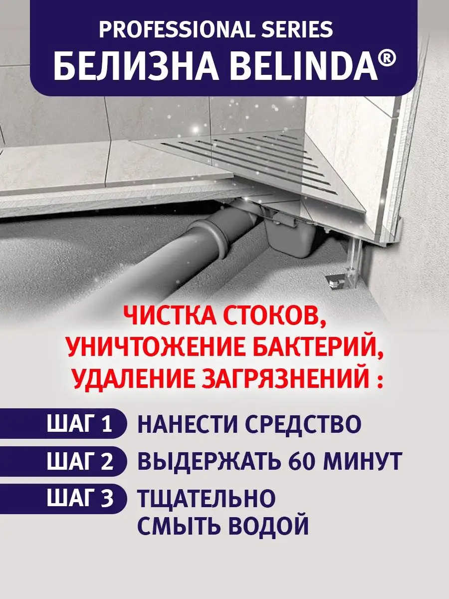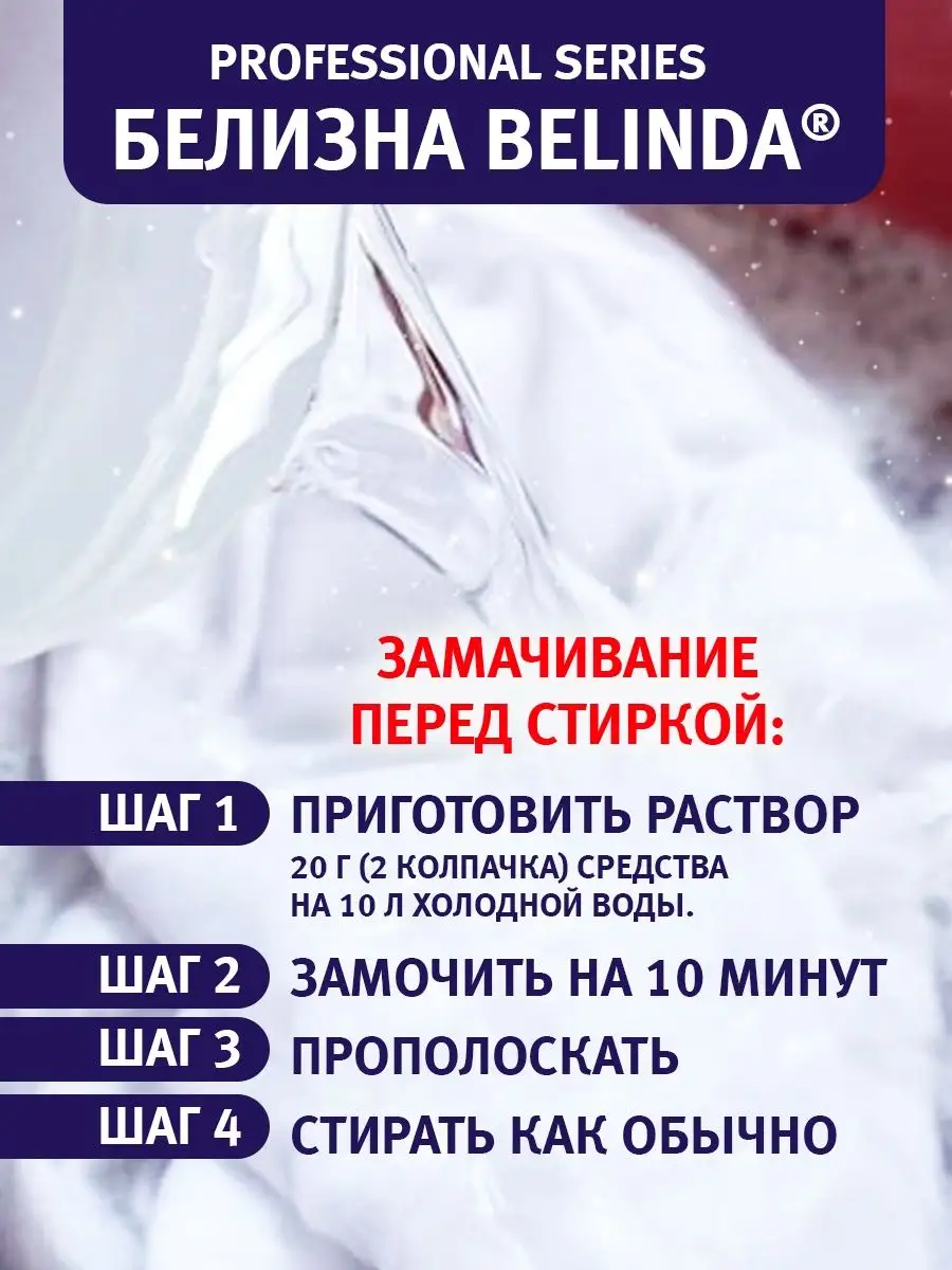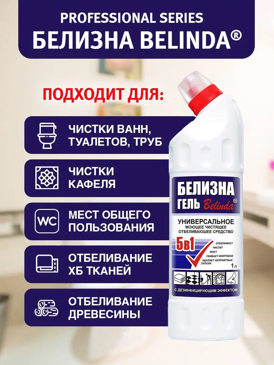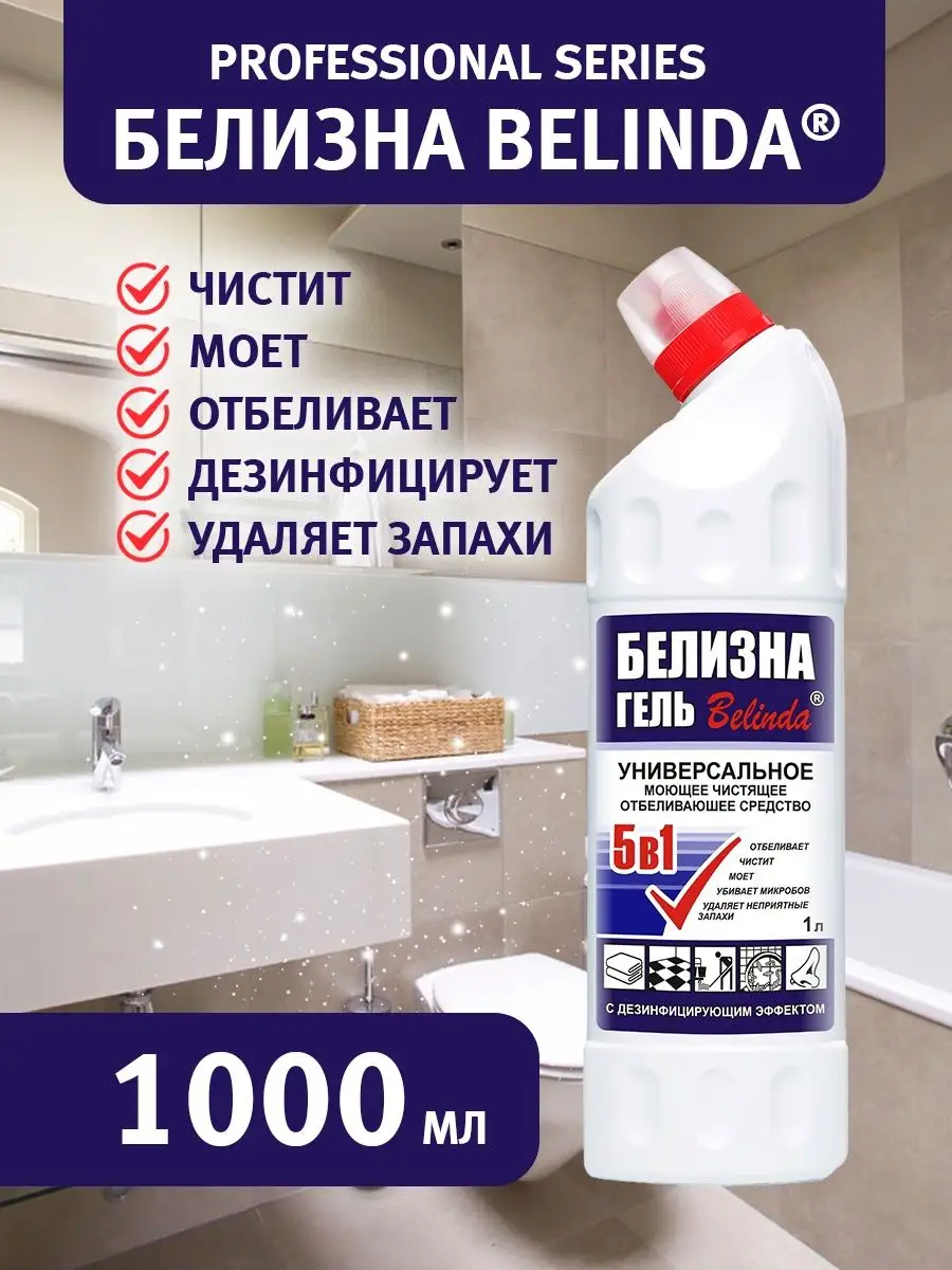 Описание: БЕЛИЗНА BELINDA® гель PROFESSIONAL SERIES- это высококонцентрированное чистящее, отбеливающее, моющее средство с дезинфицирующим эффектом. Обладает мощными отбеливающими свойствами. Высококачественный гелеобразный продукт предназначен для отбеливания хлопчатобумажных тканей, древесины, удаления пятен, для дезинфекции мест общего пользования, сантехники и труб, полов и других поверхностей, на наклонных и вертикальных поверхностях, когда необходимо продолжительное время воздействия на поверхность.ИНСТРУКЦИЯ ПО ПРИМЕНЕНИЮ - замачивание перед стиркой: приготовить раствор - 20 г (2 колпачка) средства на 10 л холодной воды. Замочить на 10 минут, прополоскать. Далее стирать как обычно.- отбеливание (наличие стойких пятен): приготовить раствор - 20 г (2 колпачка) средства на 10 л теплой (30°C-35°C) воды. Выдержать 40 минут, прополоскать. Далее стирать как обычно. - ванны, раковины, унитазы, керамическая плитка: нанести средство на поверхность, через 5 минут смыть.- для чистки стоков, уничтожения бактерий, удаления загрязнений и пятен выдержать 60 минут, смыть водой. - пол, кафель, пластик, эмалированные поверхности: мыть раствором - 20 г (2 колпачка) средства на 5 л воды. Промыть поверхность водой. МЕРЫ ПРЕДОСТОРОЖНОСТИ- Перед применением обязательно ознакомиться с инструкцией.- Использовать в хорошо проветриваемом помещении. Не вдыхать пары. При попадании средства в глаза или на кожу промыть большим количеством воды, при необходимости обратиться к врачу.- Использовать перчатки и средства для защиты лица и глаз.- Не смешивать с другими средствами во избежании опасного газа (хлора)!- Не использовать на металлических поверхностях с эмалированным, хромированным или золотым покрытием.- Не допускать попадания на ткань, мебель, обивку, ковры.- Не использовать для шерсти и шелка, а также для непрочно окрашенных тканей.- Не переливать содержимое в другие емкости.- После работы тщательно вымыть руки.- Хранить в прохладном месте, плотно закрытым, в вертикальном положении. Предохранять от попадания прямых солнечных лучей. Хранить в недоступном для детей месте.Состав: гипохлорит натрия, натрия хлорид, комплекс поверхностно -активных веществ, загуститель, отдушка, вода.