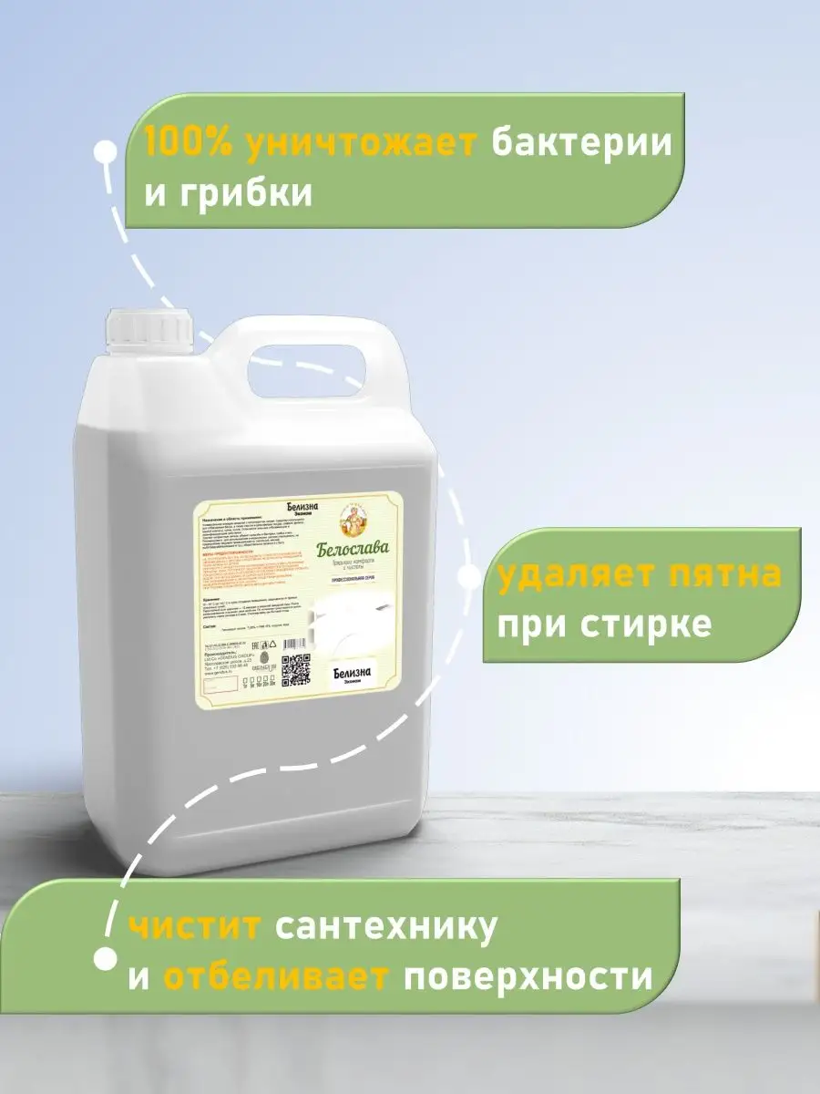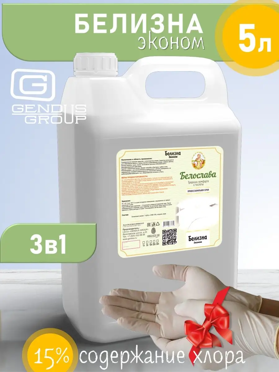 Описание: Щелочное универсальное моющее средство с гипохлоритом натрия. Средство используется для отбеливания белья, а также очистки и дезинфекции посуды, кафеля, фаянса, ванной комнаты, кухни, полов. Отличается сильным отбеливающим и дезинфицирующим действием.Удаляет неприятные запахи, убивает микробы и бактерии, грибок и мох.Рекомендовано для использования в медицинских, детских учреждениях, на предприятиях пищевой промышленности, (молочной, мясной, рыбоперерабатывающей и т.д.), общественного питания и в быту.Жидкий щелочной мало пенный концентрат с активным хлором. С хорошим обезжиривающим и дезинфицирующим действием. Полностью растворяется в воде любой жёсткости и температуры. Эффективно против органических, жировых, белковых загрязнений, плесени, слизи и мха, пятен от кофе и чая, крови и зелени на полимерных покрытиях, кафеле и др. керамике, стёклах, пластмассах, мармолеуме и линолеуме, тераццо, натуральном и искусственном камне, бетоне, нержавеющей стали, дереве и др. поверхностях. Удаляет пятна на белье, убивает бактерии неприятного запаха. Экологически безопасно. Пожаро- и взрывобезопасно. Замерзает, после размораживания свойства сохраняются.Способ применения:1.Ручная стирка:разбавьте ½ стакана (100 мл)отбеливателя в 15 л холодной воды, замочите белье на 10-15 минут, прополощите в холодной воде, смените воду и начните стирку.Стирка в стиральной машине активаторного типа: разбавьте ½ стакана (100 мл) отбеливателя в 20 л холодной воды, загрузите белье и включите машину на 10-15 минут, прополощите белье в холодной воде, смените воду и начните стирку.Стирка в автоматической стиральной машине: загрузите белье, засыпьте стиральный порошок в отделение для основной стирки. Выберите программу для предварительной стирки, по мере заполнения машины водой влейте ½ стакана (100 мл) отбеливателя в отделение для предварительной стирки.Для дезинфекции посуды, пластика, унитазов, ванн, мусорных ведер и т.д. приготовьте раствор из расчета 60-100 мл отбеливателя на один литр воды, нанесите на обрабатываемую поверхность и оставьте на 60 минут, затем промойте водой.Меры предосторожности:Не употреблять внутрь! Использовать только по назначению! Не перемешивать с другими средствами! Не допускать попадания в глаза! Беречь от детей!При работе с концентратом необходимо использовать резиновые перчатки, очки, респиратор, защитную одежду! При попадании концентрата на кожу и на слизистую оболочку немедленно промыть водой. При необходимости обратиться к врачу..При перемешивании с кислотными средствами возможно выделения ядовитого газа (хлора).!При проливе концентрата убрать ветошью или губкой. Компоненты средства биологически разлагаемые, допускается слив в канализацию.Хранение:От -15° С до +40° С в сухих складских помещениях, защищенных от прямых солнечных лучей.Гарантийный срок хранения — 12 месяцев в закрытой заводской таре. После размораживания сохраняет свои свойства. По истечении срока годности нужно увеличить норму расхода в 2 раза. Утилизировать как бытовой отход.Состав:Гипохлорит натрия, н-ПАВ <5%, отдушка, вода.Белизна 3 в 1 от Белославы идеально подойдёт для уборки дома. Средство белизна это профессиональный отбеливатель для белья и одежды. Чистящее средство подходит для туалета и ванной. Чистящий и мощный отбеливающий пятновыводитель для белья 