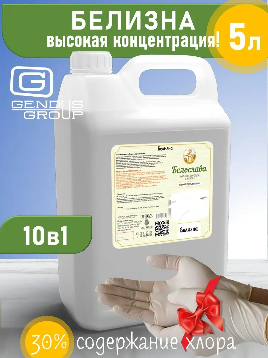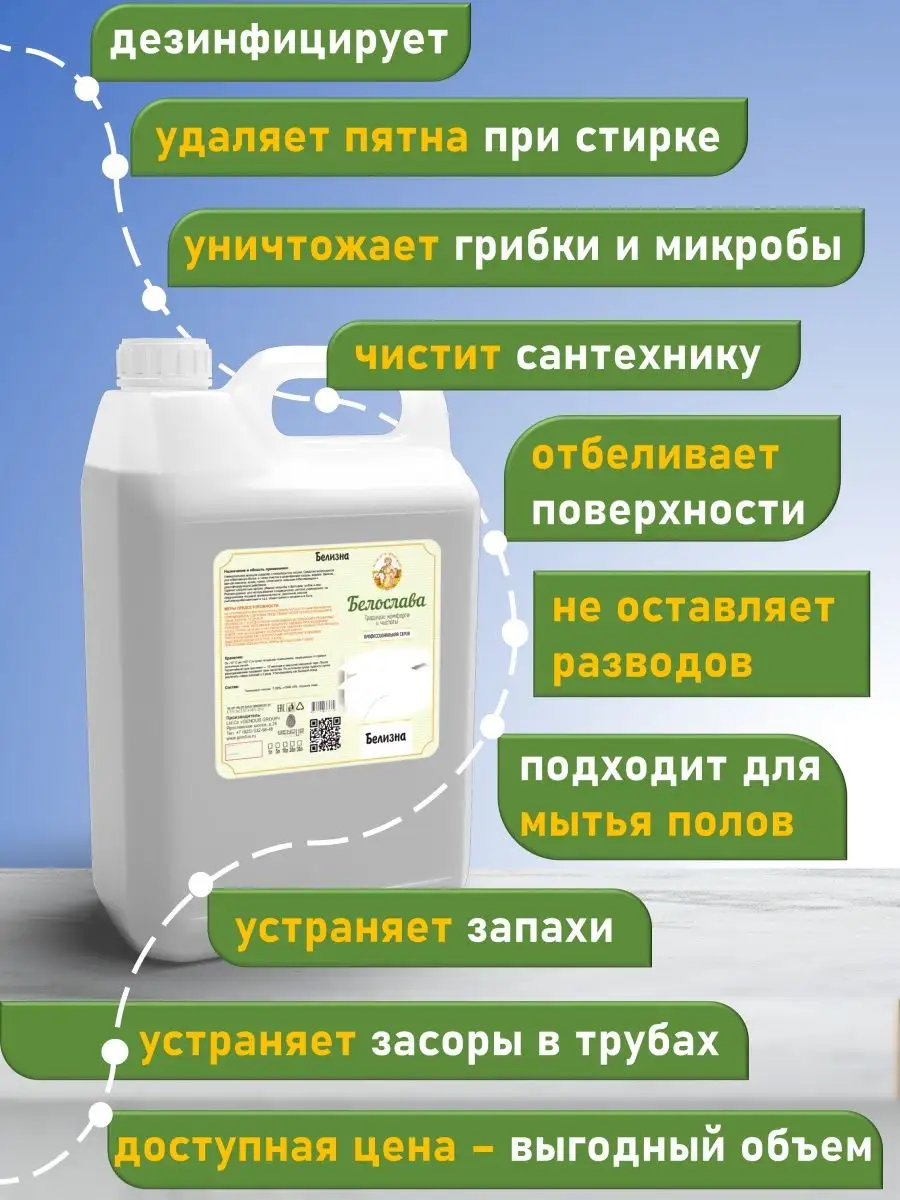 Описание: Щелочное универсальное моющее средство с гипохлоритом натрия. Средство используется для отбеливания белья, а также очистки и дезинфекции посуды, кафеля, фаянса, ванной комнаты, кухни, полов. Отличается сильным отбеливающим и дезинфицирующим действием.Удаляет неприятные запахи, убивает микробы и бактерии, грибок и мох.Рекомендовано для использования в медицинских, детских учреждениях, на предприятиях пищевой промышленности, (молочной, мясной, рыбоперерабатывающей и т.д.), общественного питания и в быту.Жидкий щелочной мало пенный концентрат с активным хлором. С хорошим обезжиривающим и дезинфицирующим действием. Полностью растворяется в воде любой жёсткости и температуры. Эффективно против органических, жировых, белковых загрязнений, плесени, слизи и мха, пятен от кофе и чая, крови и зелени на полимерных покрытиях, кафеле и др. керамике, стёклах, пластмассах, мармолеуме и линолеуме, тераццо, натуральном и искусственном камне, бетоне, нержавеющей стали, дереве и др. поверхностях. Удаляет пятна на белье, убивает бактерии неприятного запаха. Экологически безопасно. Пожаро- и взрывобезопасно. Замерзает, после размораживания свойства сохраняются.Способ применения:1.Ручная стирка:разбавьте ½ стакана (100 мл)отбеливателя в 15 л холодной воды, замочите белье на 10-15 минут, прополощите в холодной воде, смените воду и начните стирку.Стирка в стиральной машине активаторного типа: разбавьте ½ стакана (100 мл) отбеливателя в 20 л холодной воды, загрузите белье и включите машину на 10-15 минут, прополощите белье в холодной воде, смените воду и начните стирку.Стирка в автоматической стиральной машине: загрузите белье, засыпьте стиральный порошок в отделение для основной стирки. Выберите программу для предварительной стирки, по мере заполнения машины водой влейте ½ стакана (100 мл) отбеливателя в отделение для предварительной стирки.Для дезинфекции посуды, пластика, унитазов, ванн, мусорных ведер и т.д. приготовьте раствор из расчета 60-100 мл отбеливателя на один литр воды, нанесите на обрабатываемую поверхность и оставьте на 60 минут, затем промойте водой.Меры предосторожности:Не употреблять внутрь! Использовать только по назначению! Не перемешивать с другими средствами! Не допускать попадания в глаза! Беречь от детей!При работе с концентратом необходимо использовать резиновые перчатки, очки, респиратор, защитную одежду! При попадании концентрата на кожу и на слизистую оболочку немедленно промыть водой. При необходимости обратиться к врачу..При перемешивании с кислотными средствами возможно выделения ядовитого газа (хлора).!При проливе концентрата убрать ветошью или губкой. Компоненты средства биологически разлагаемые, допускается слив в канализацию.Хранение:От -15° С до +40° С в сухих складских помещениях, защищенных от прямых солнечных лучей.Гарантийный срок хранения — 12 месяцев в закрытой заводской таре. После размораживания сохраняет свои свойства. По истечении срока годности нужно увеличить норму расхода в 2 раза. Утилизировать как бытовой отход.Состав:Гипохлорит натрия, н-ПАВ <5%, отдушка, вода.Белизна 3 в 1 от Белославы идеально подойдёт для уборки дома. Средство белизна это профессиональный отбеливатель для белья и одежды. Чистящее средство подходит для туалета и ванной. Чистящий и мощный отбеливающий пятновыводитель для белья 