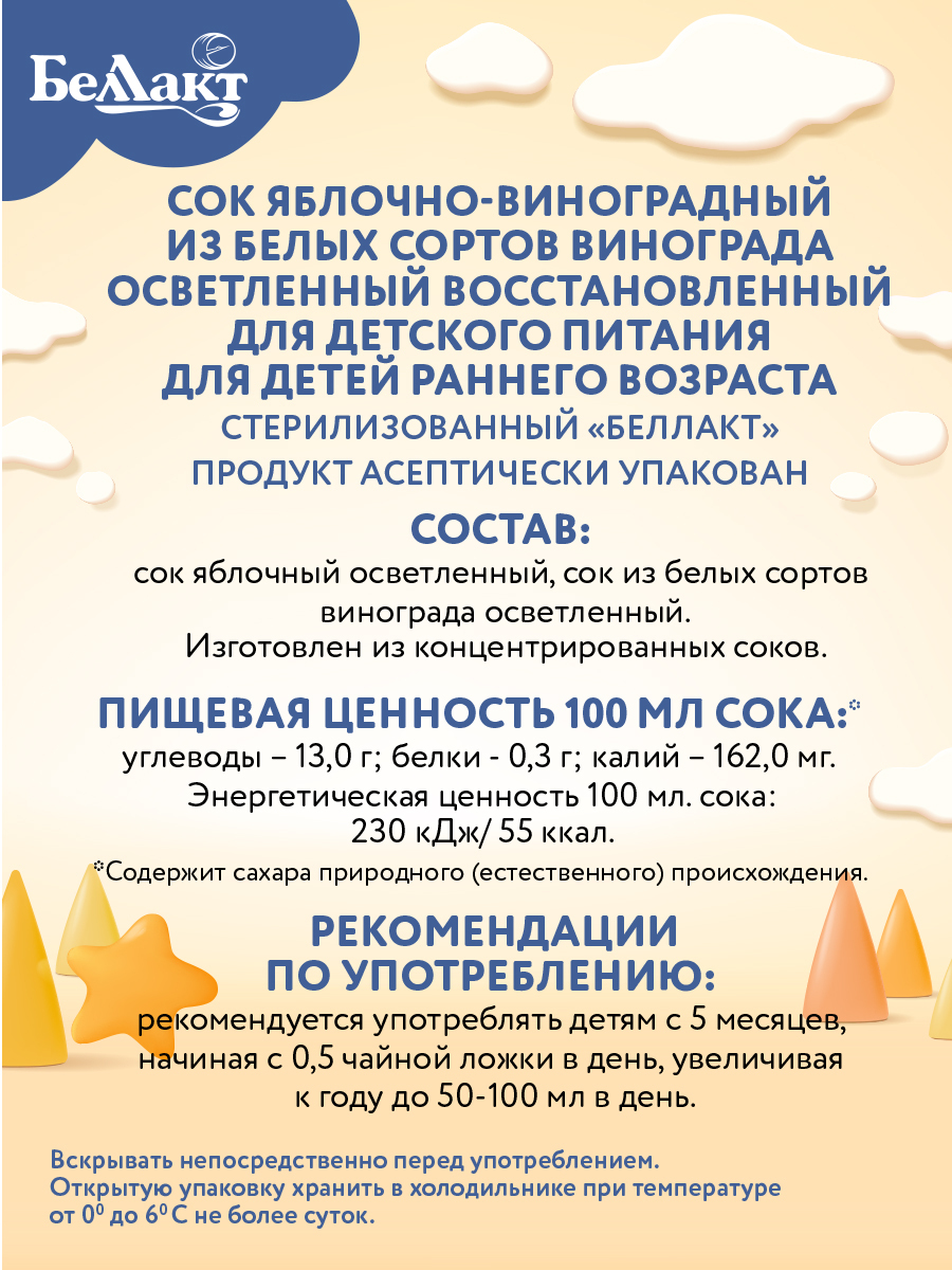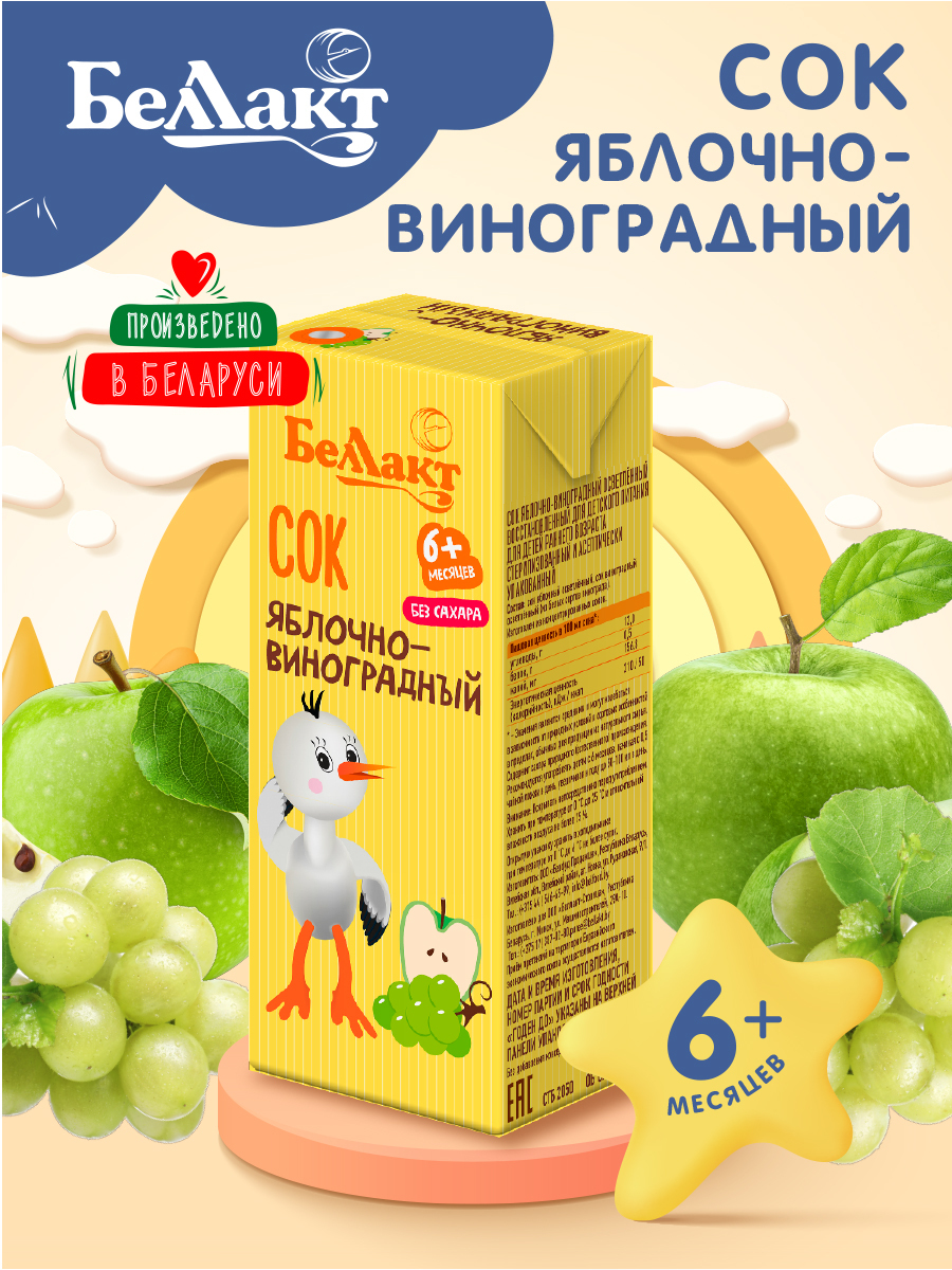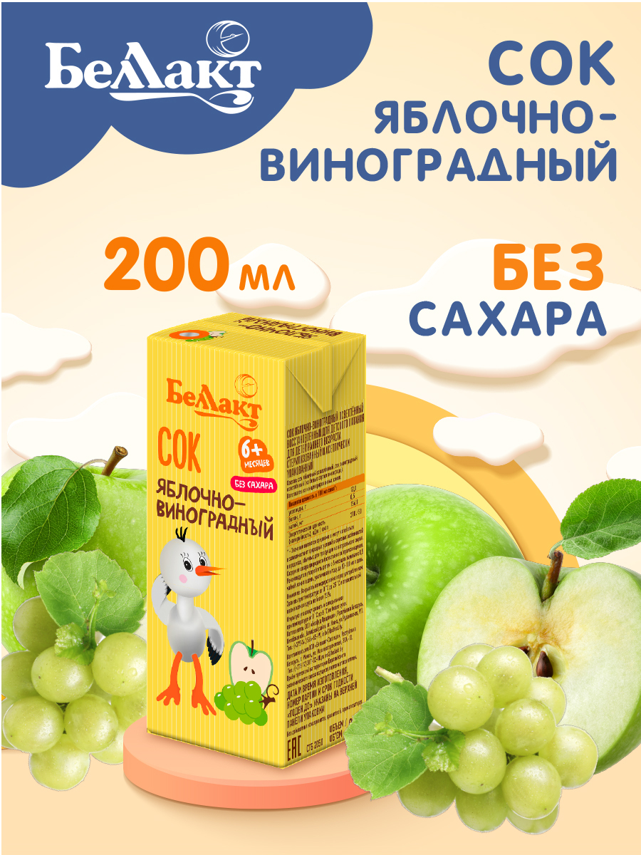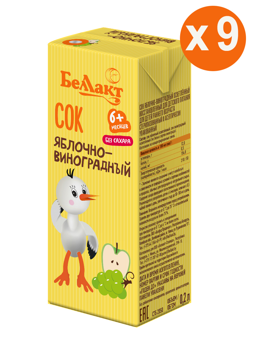 БЕЛЛАКТ Яблочно-виноградный сок детский маленький натуральный 200мл Х 9 шт