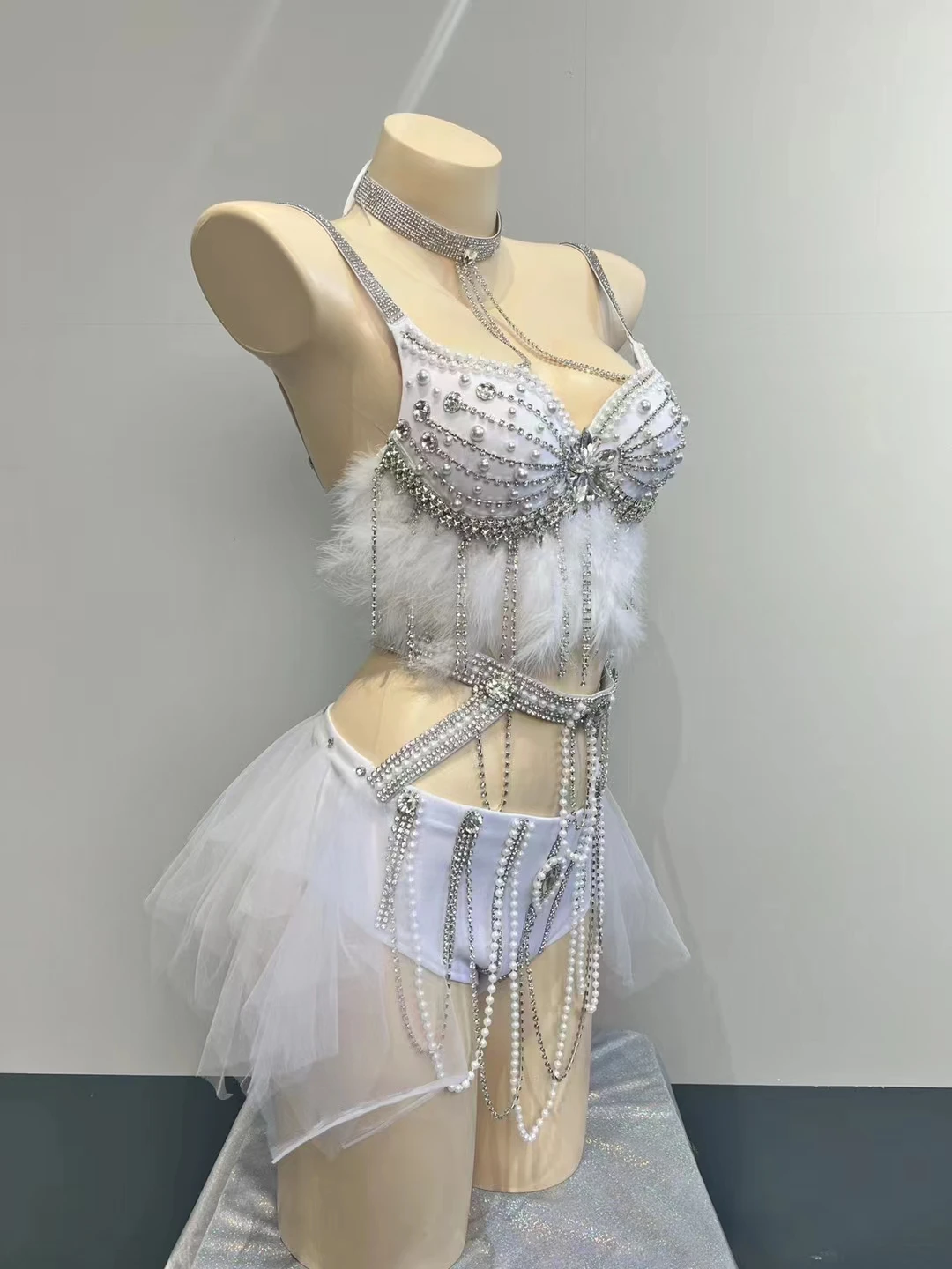 Белое перо Бисероплетение Марлевое бикини боди электронная музыкальная искусственная одежда диджейская танцевальная эротическая одежда