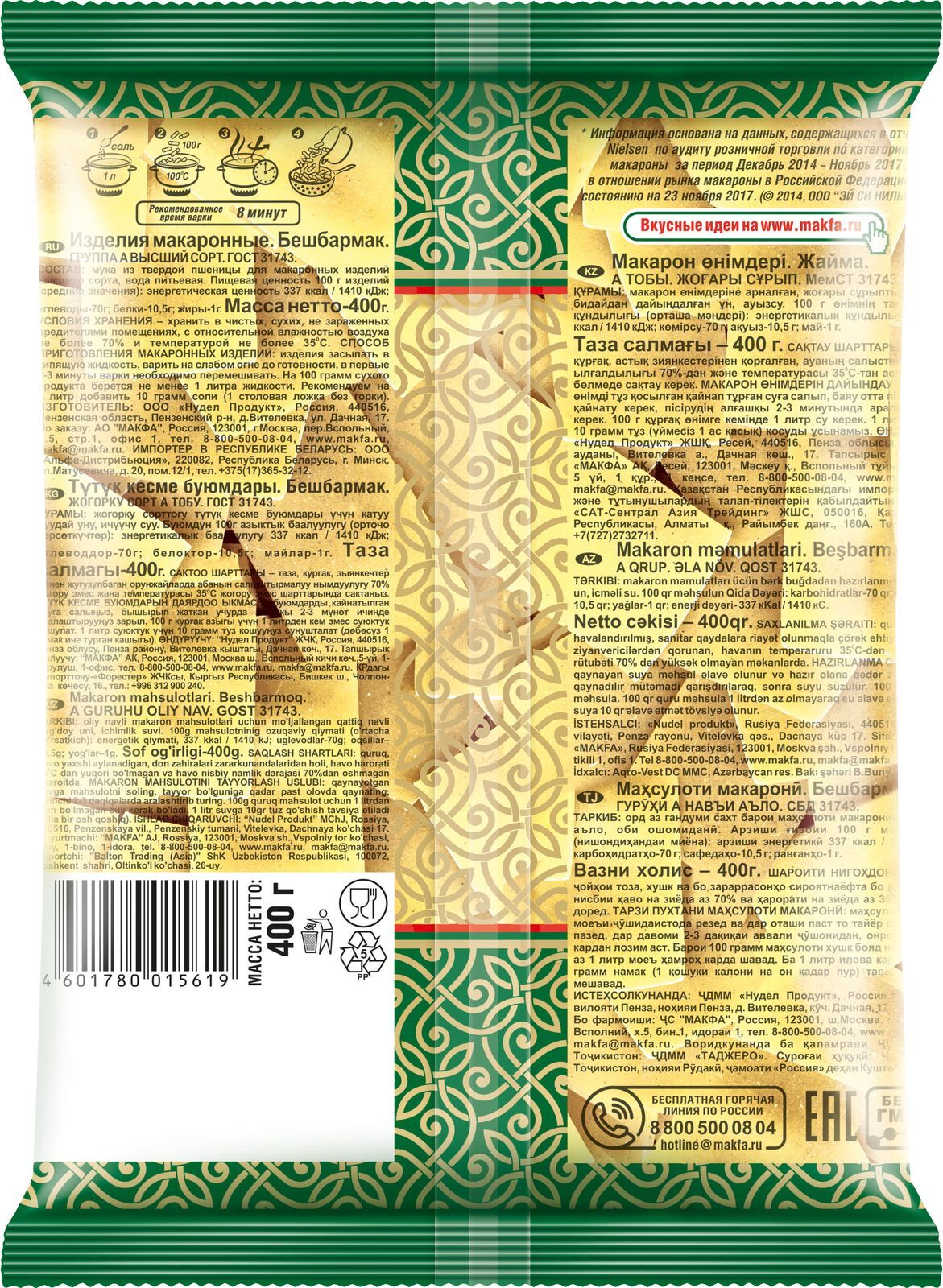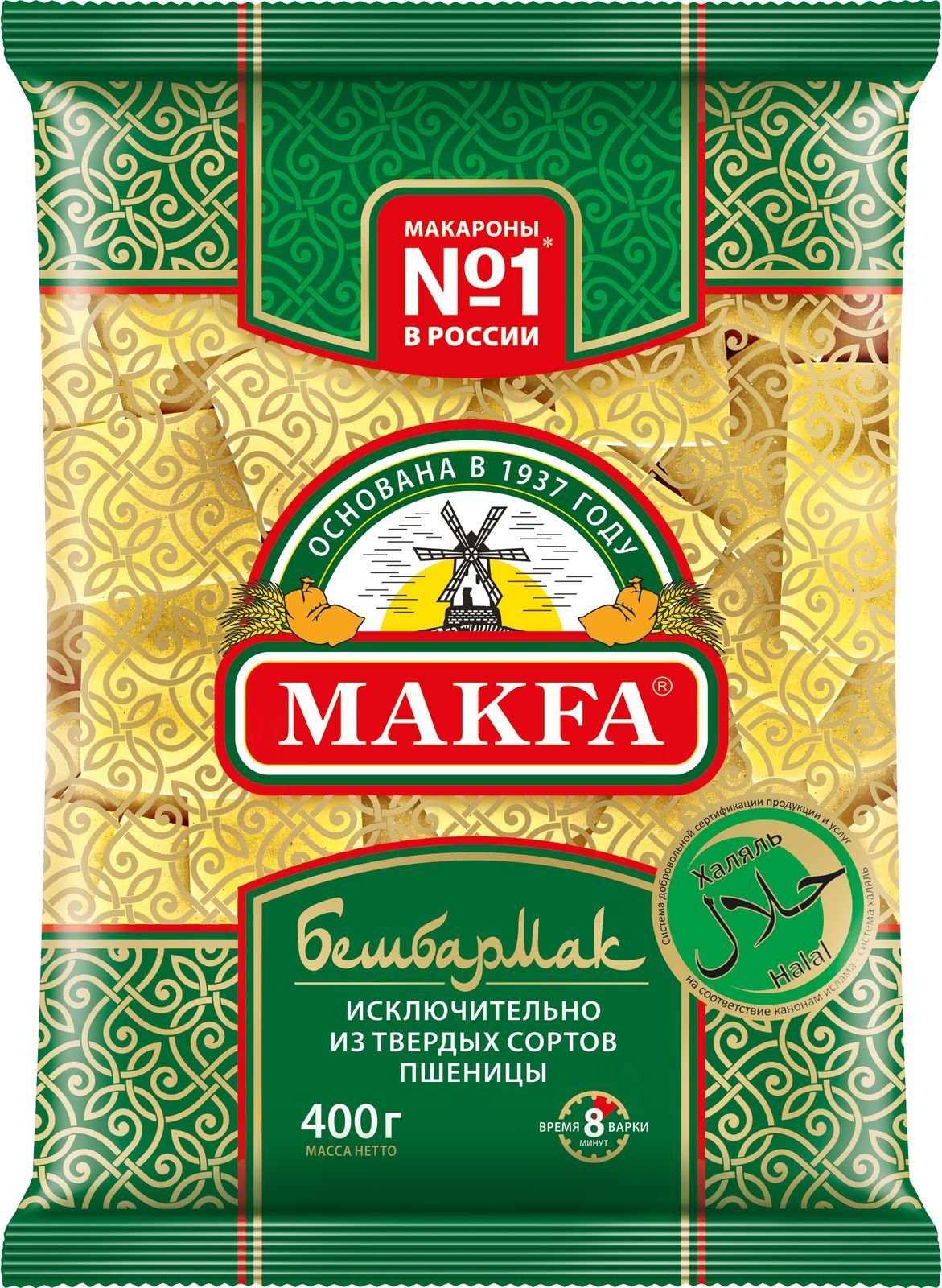 Описание: Традиционная лапша прямоугольной формы и приятного золотистого цвета. Бешбармак изготовлен из твердой пшеницы и имеет 100% натуральный состав. Благодаря твердым сортам пшеницы бешбармак сохраняет форму в процессе приготовления. Особая прямоугольная нарезка позволяет приготовить блюдо в классическом варианте. Внешний вид практически не отличается от бешбармака, приготовленного в домашних условиях с замешиванием и раскаткой теста. Но при этом затраты времени на приготовление минимальны. Продукция прошла сертификацию «Халяль». Бешбармак — праздничное блюдо, которое готовится из большого количества макаронных изделий прямоугольной формы, мелко порубленного мяса и репчатого лука. Особая форма макаронных изделий сложилась исторически: раньше блюдо если руками. Бешбармак MAKFA — это современное и простое решение для приготовления сложного блюда!