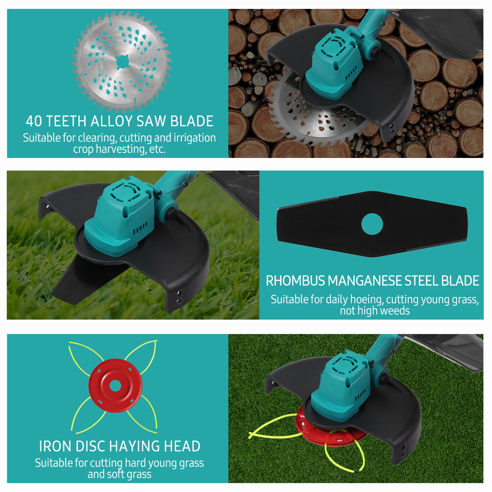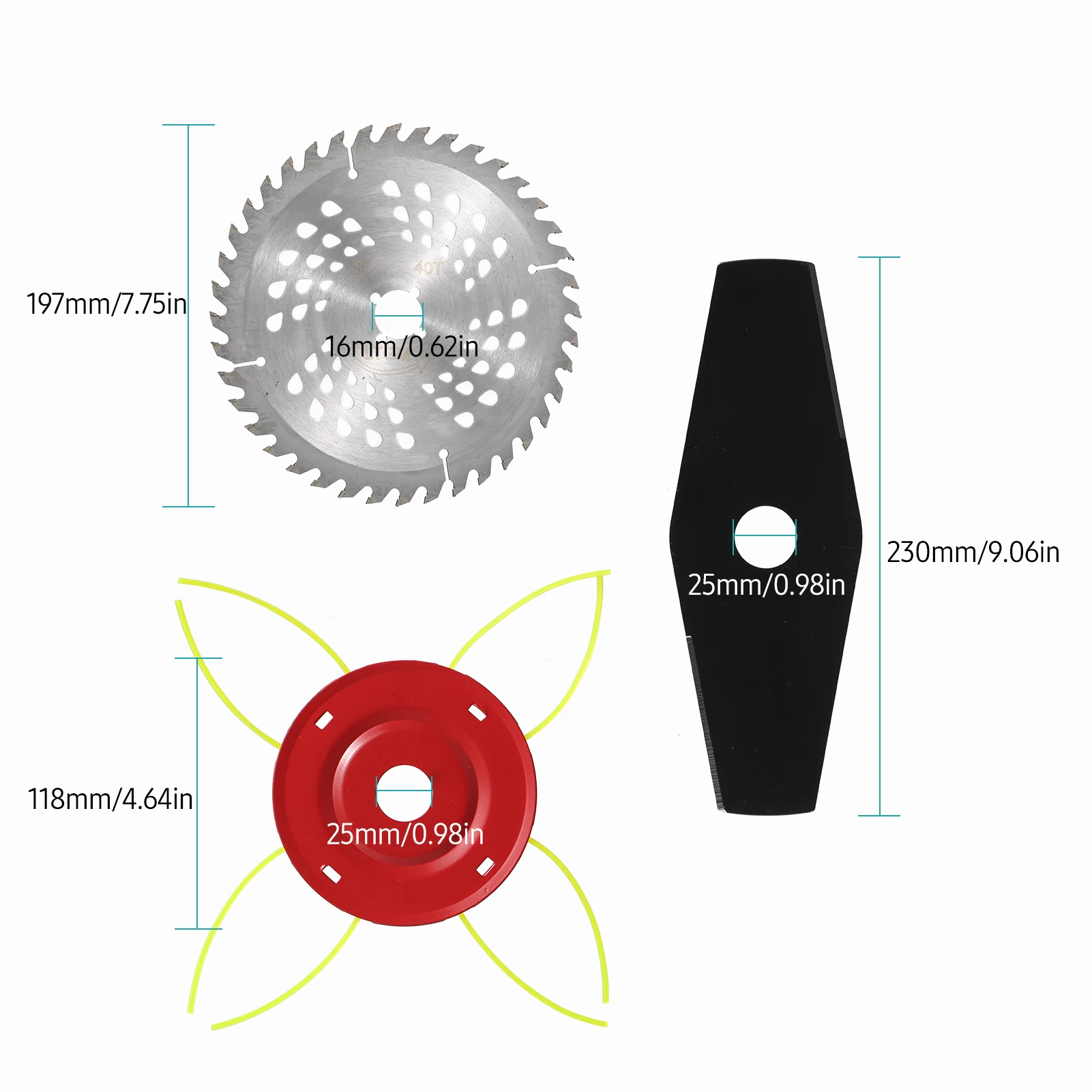 【Три рабочих Modes】 40 зубьев легированной пилы: подходит для очистки, резки и орошения урожая и т. д.; Ромбовидная клинок из марганцевой стали: подходит для ежедневной трапезы, резки молодой травы, не высоких сорняков; железная дисковая головка: подходит для резки твердой молодой травы и мягкой травы.
