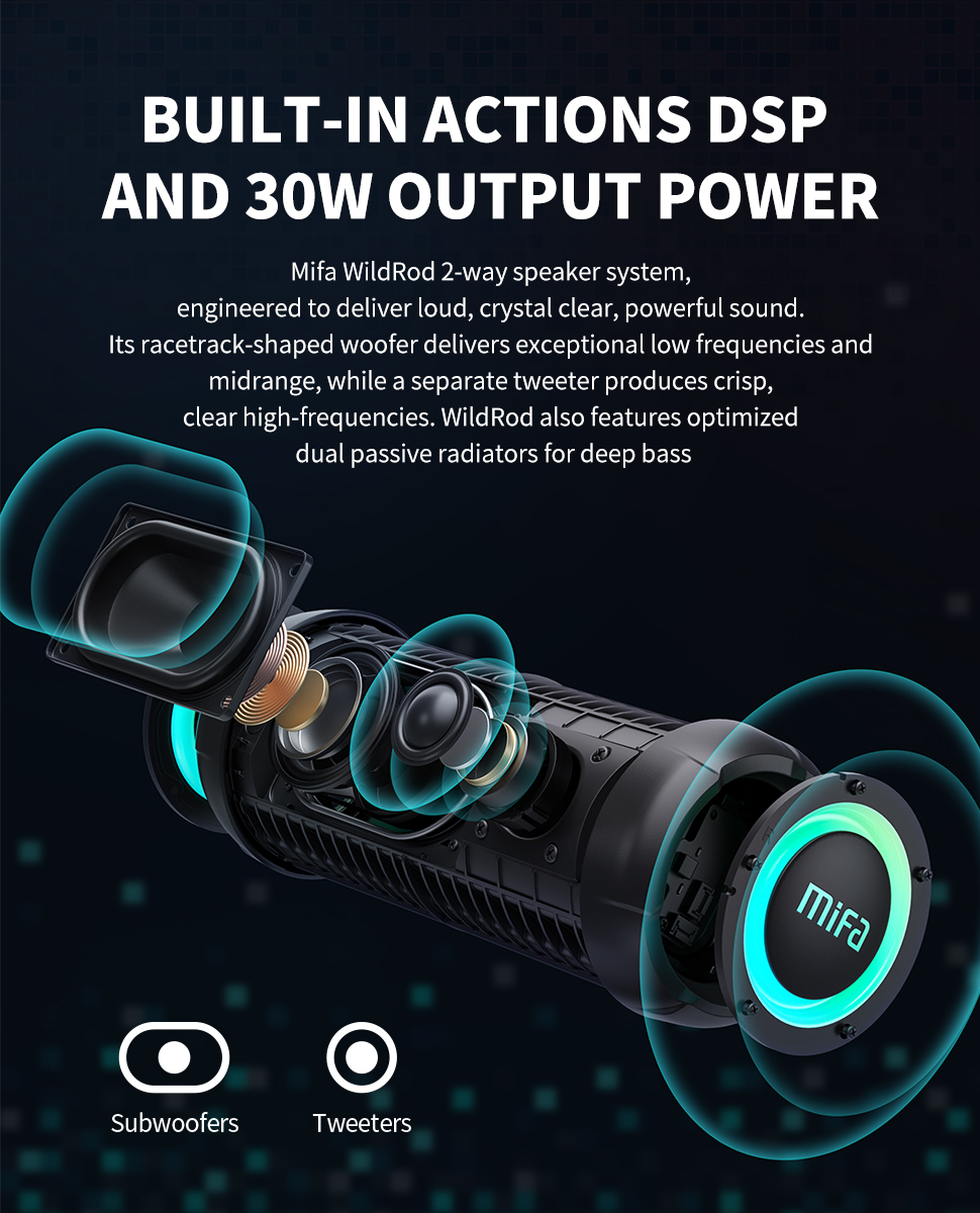 2-полосная акустическая система Mifa WildRod, разработанная для обеспечения громкого, кристально чистого и мощного звука. Его низкочастотный динамик в форме гонок