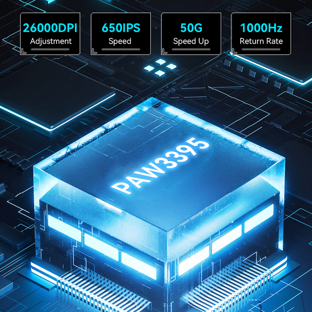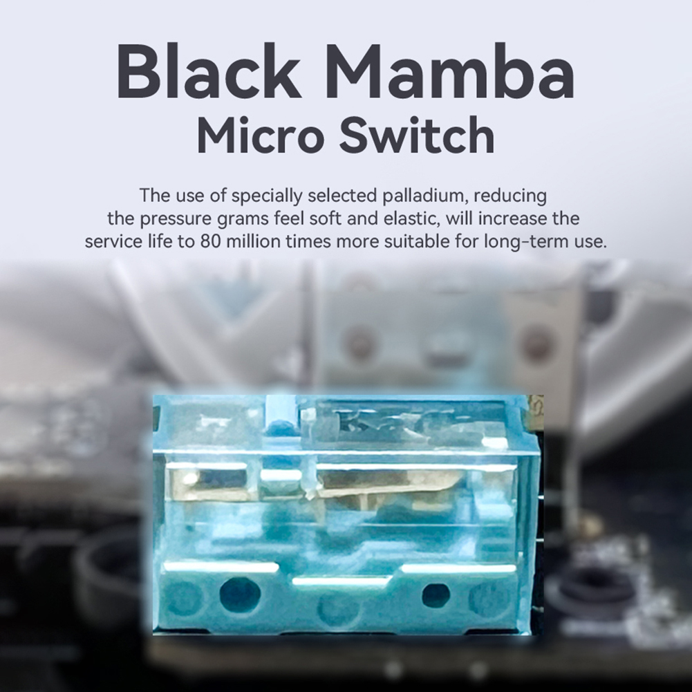 2. Высокопроизводительный чип и переключатели:Оснащенная оригинальным чипом PAW3395 и переключателями Kailh Black Mamba 8000W, эта оптическая мышь обеспечивает точную работу и выдающуюся чувствительность, что делает ее идеальной для требовательных киберспортивных игр.