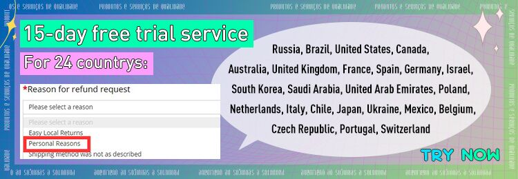 Мы предлагаем 15-дневную бесплатную пробную версию нашей продукции в 24 странах, если вам не понравится то, что вы получили, просто верните ее и получите полный возврат! Но не забудьте выбрать "Личные причины" в качестве причины спора, чтобы вам не пришлось платить за доставку и получить полный возврат при возврате! (При других причинах с вас могут потребовать большую плату за доставку).