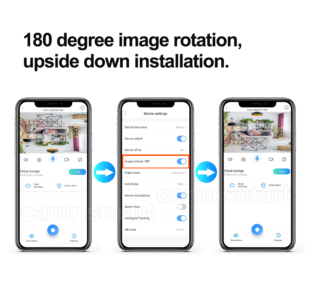 Функция поворота изображения на 180 °, можно настроить в приложении, не беспокойтесь о перевернутой установке.