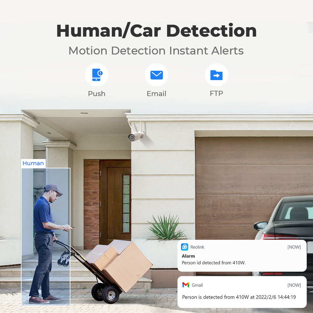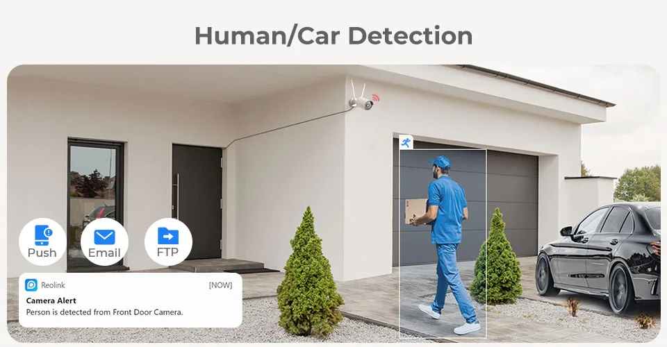 Благодаря интеллектуальной технологии обнаружения людей и автомобилейэта IP-камера PoE может распознавать людей и автомобилисреди других движущихся объектов. Получайте оповещения, когда подозрительный человек или машина находятся возле вашего дома или магазина.