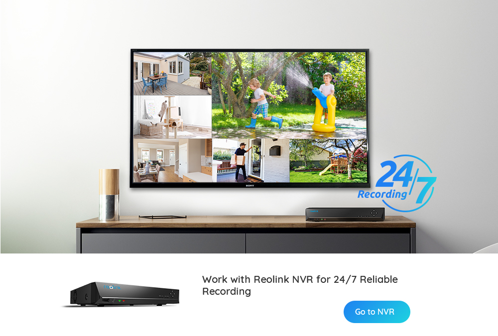 Эта камера безопасности может вести непрерывную запись при подключении к сетевому видеорегистратору Reolink или системе видеонаблюдения.