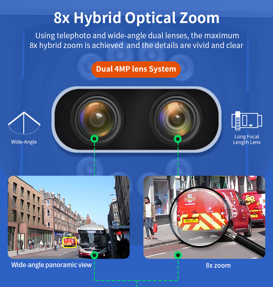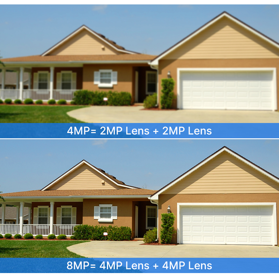 Dual-lens and high pixel for clearer images. Our camera is equipped with two 4MP (2MP) lenses , 2 lenses can bring you a better image experience, clearer than the traditional 4MP(2MP) .