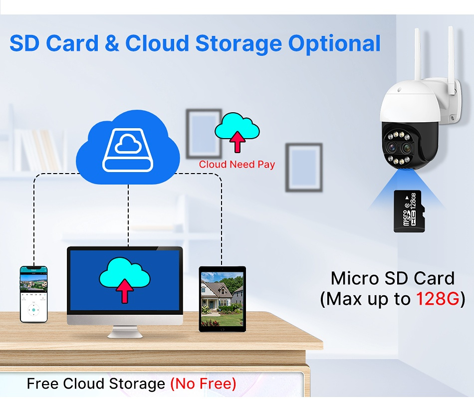The security camera can store pictures and videos through SD card(optional) or cloud storage (subscrition required) , you can view the saved moments at any time through APP or memory card. (With memory card, support playback )