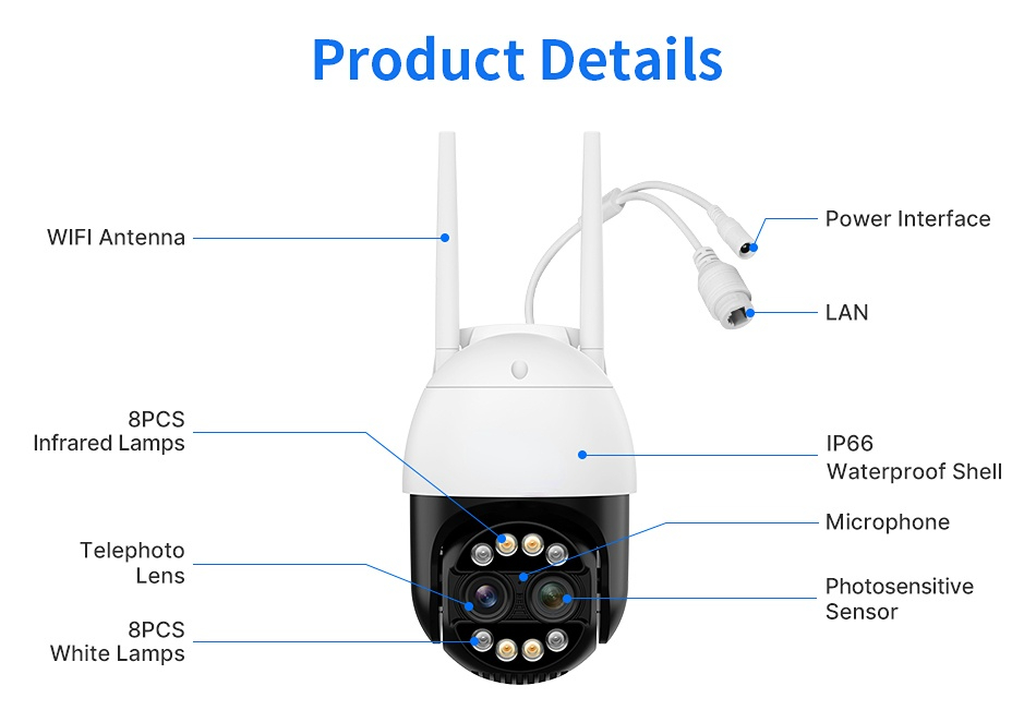 Built-in White LED and IR-Cut led lights, up to 50 meters night vision distance, so that you can get high quality video even at night.