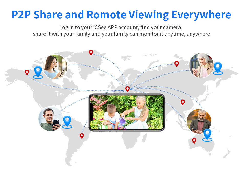 Share the security camera with family menbers ,Support multi-users view simultaneously and support multi cameras devices in one App