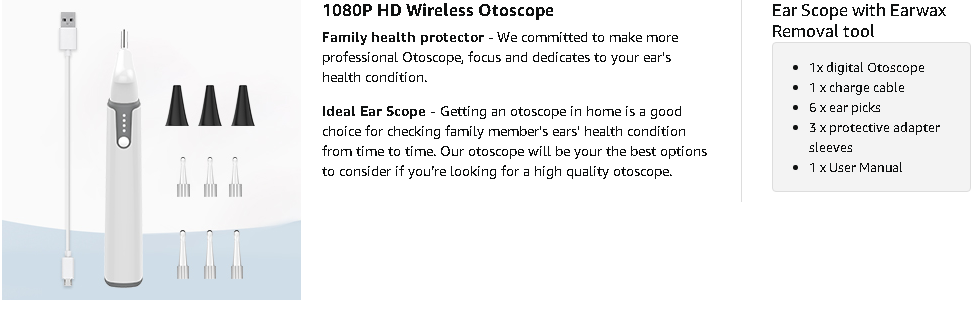 【Комплектация】 Примечание: Если у приложения «Умный отоскоп» возникли проблемы, попробуйте инструкцию «BKWIFI», ушные вкладыши разных размеров, защитные переходные рукава и зарядный кабель. Если у вас возникнут вопросы по товару, свяжитесь с нами в любое время. Мы предлагаем 1 год гарантии, полный возврат средств и время ответа 24 часа.