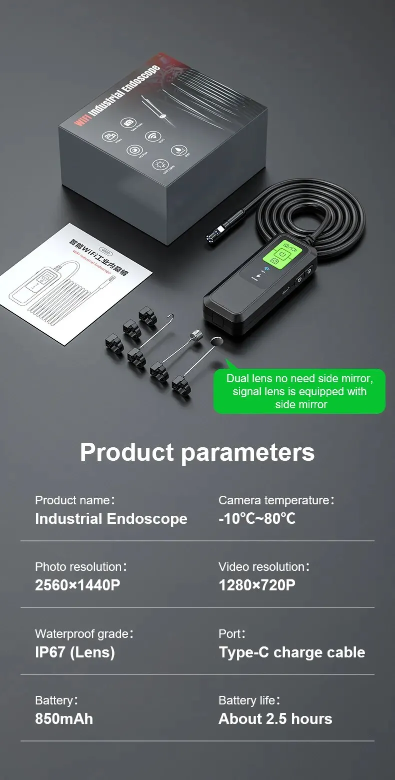 • Камера с двумя объективами:Камера эндоскопа имеет как широкоугольный, так и зум-объектив, что позволяет проводить тщательный осмотр труднодоступных мест.