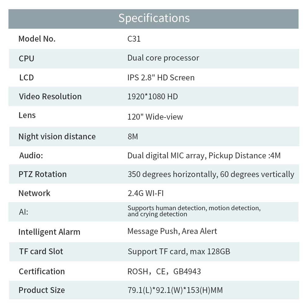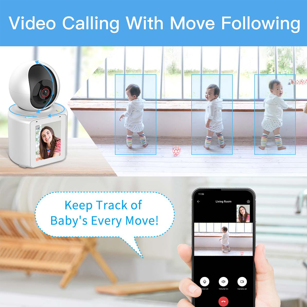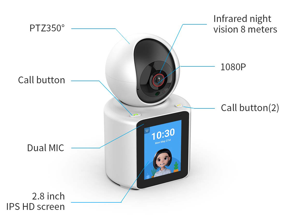 ✔Поворот камеры/Функция видеозвонка одной кнопкой Камера состоит из двух частей: верхняя часть представляет собой вращающийся объектив камеры (широкий угол 120 °), который может управлять стабилизатором для поворота влево и вправо на 355 ° и вверх и вниз по вертикали на 90 °. Нижняя часть камеры представляет собой экран IPS 2,8 дюйма LPS (цветное изображение), камера имеет кнопку вызова в одно касание, нажмите кнопку подключения одним касанием на камере наблюдения, чтобы быстро установить видео соединение (Примечание: можно подключить только один мобильный телефон);