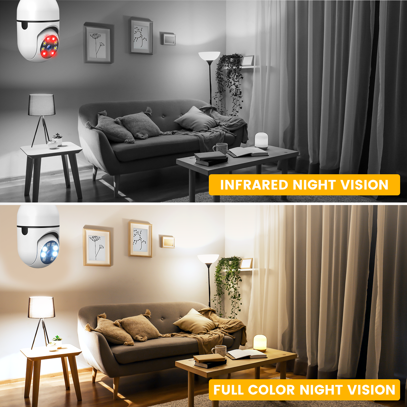 Камера с лампочкой в помещении и на открытом воздухе использует 4 ИК-светодиода и 4 светодиода белого света, снимает 2-мегапиксельные (1920*1080P) HD-изображения. Обеспечивает четкое изображение даже ночью, интеллектуальное ночное видение обеспечивает обычное ночное видение и цветное ночное видение, вы можете легко выбрать в соответствии с вашими потребностями.