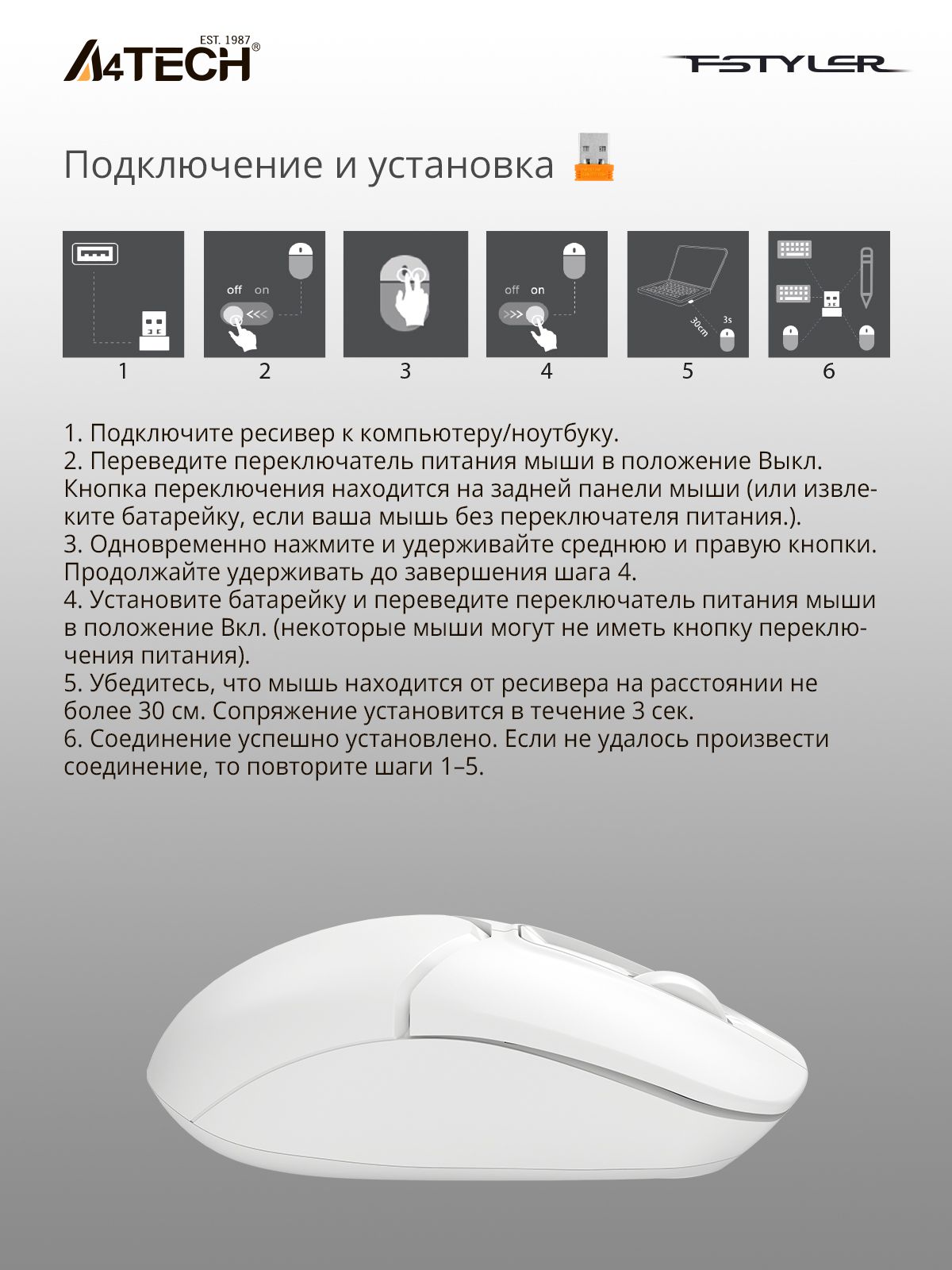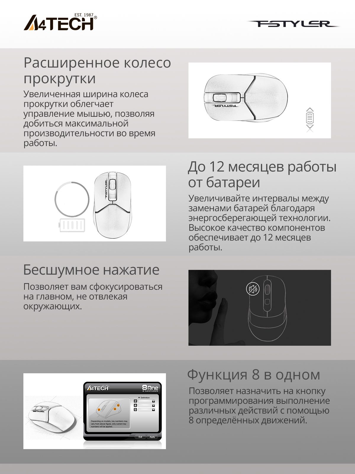 Беспроводная мышь A4Tech Fstyler FG12S с бесшумным кликом, 1000 dpi, 3 кнопки, silent