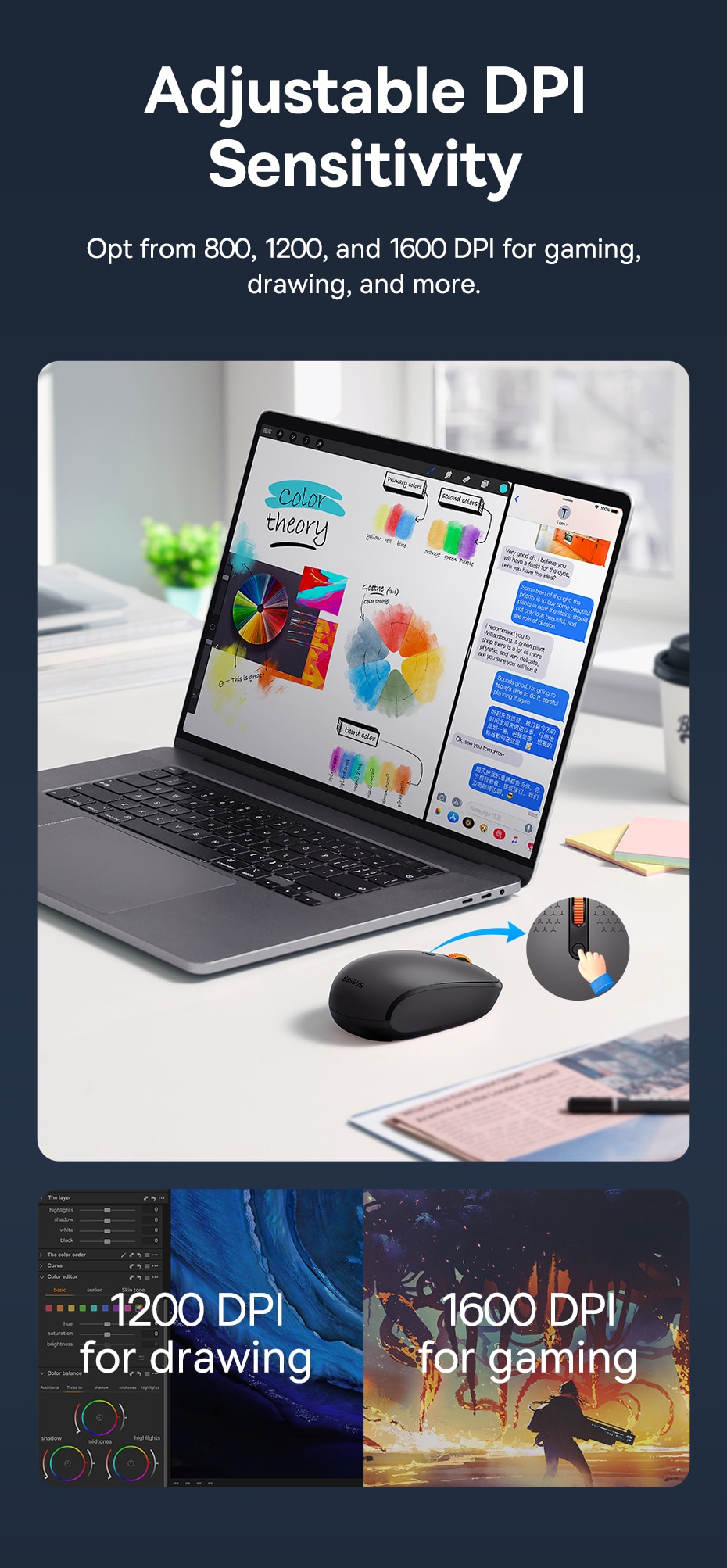 • Высокое разрешение DPI :Благодаря высокому разрешению 1600 точек на дюйм вы можете наслаждаться точными и точными движениями курсора для улучшения работы пользователя.
