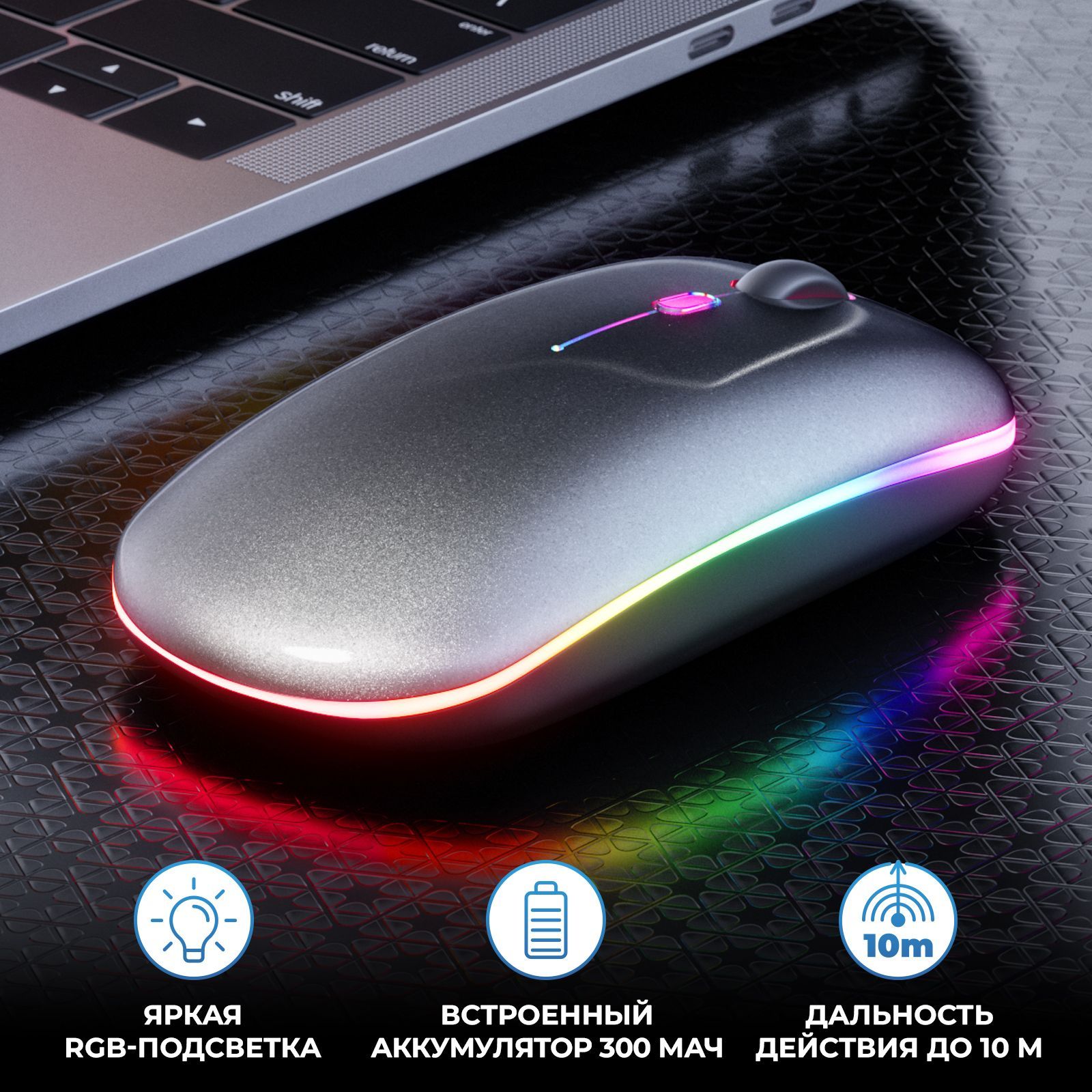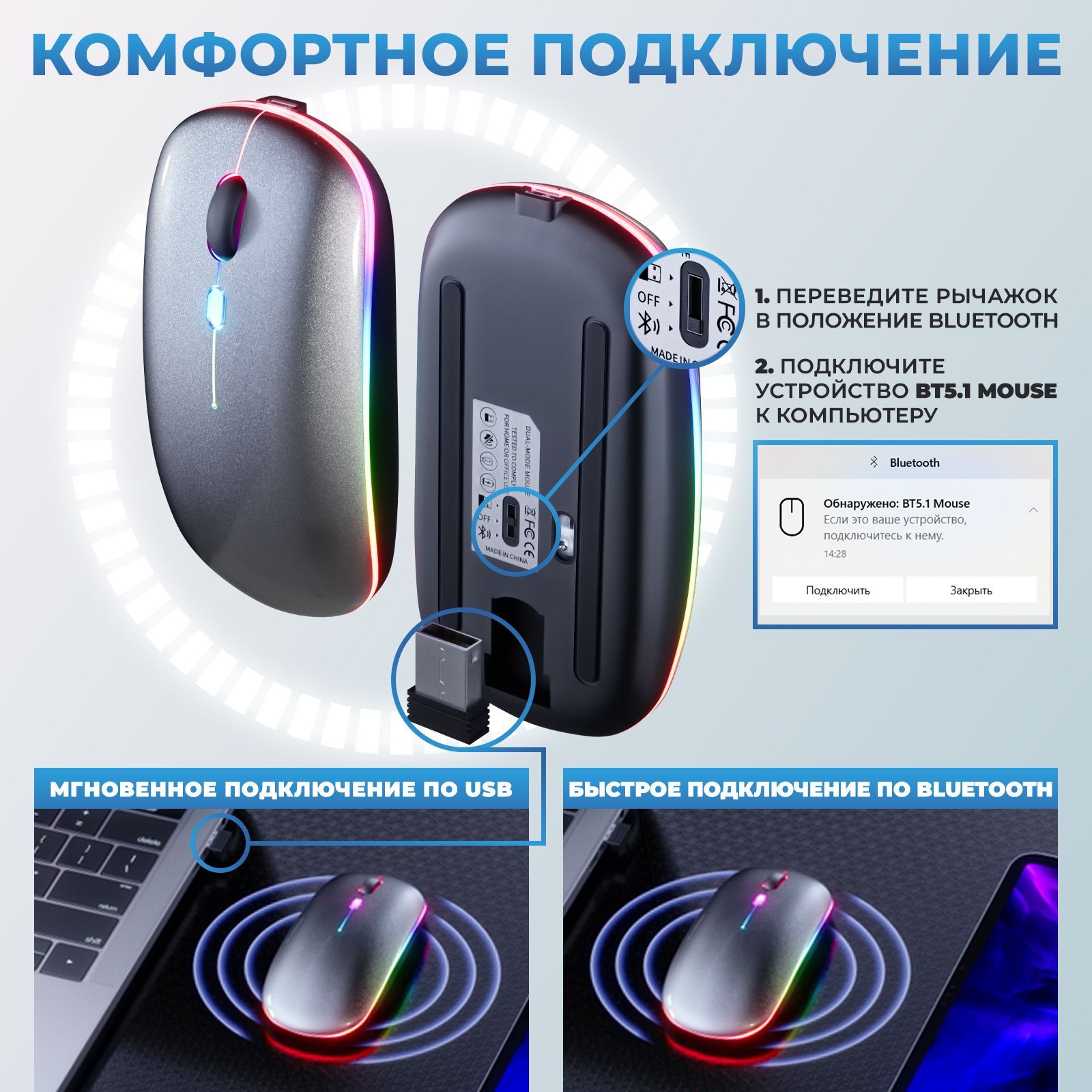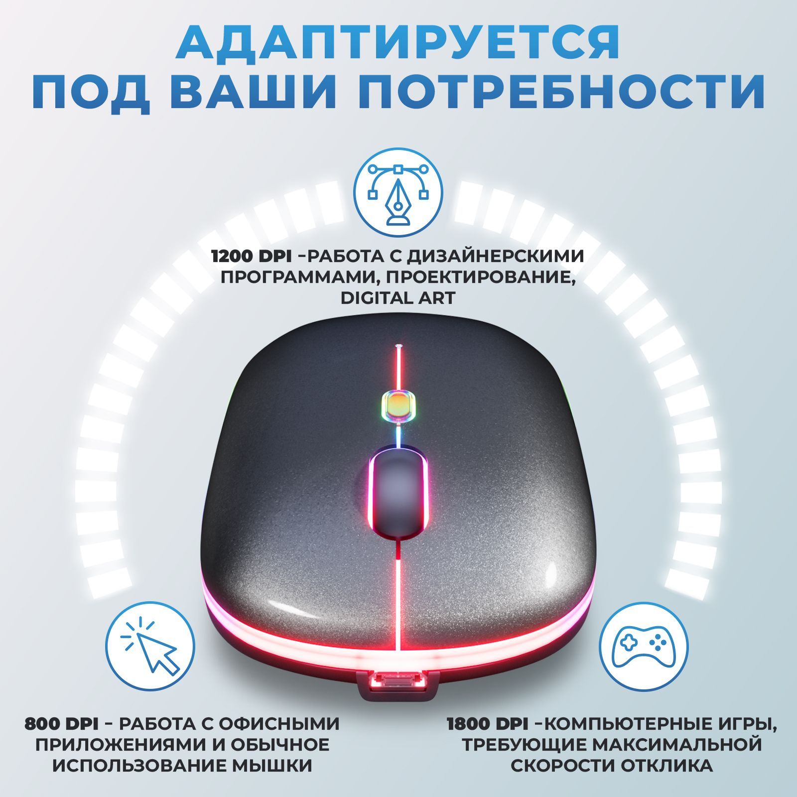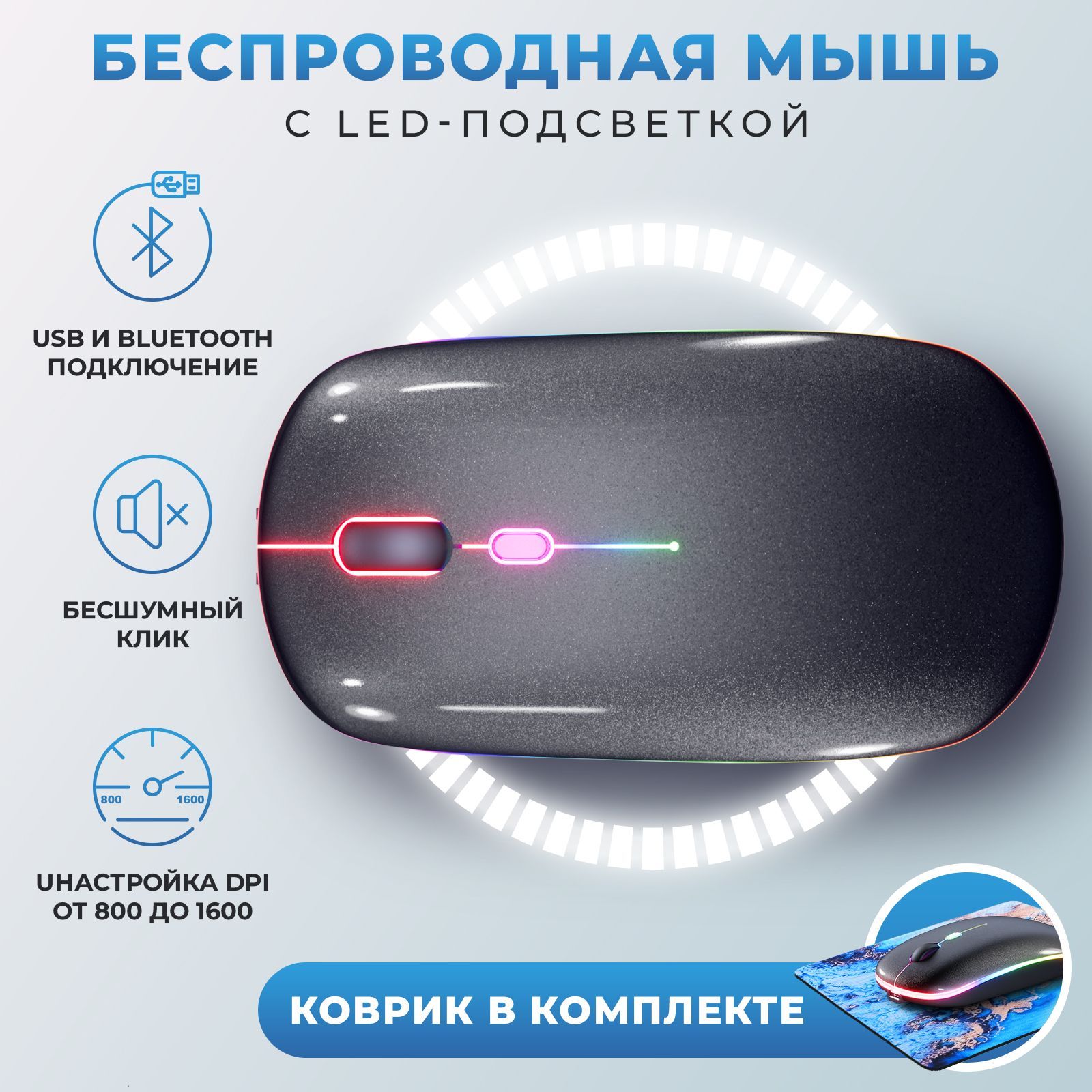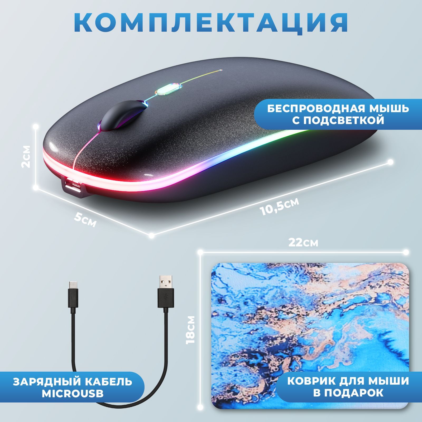 Описание: Беспроводная светодиодная мышь - незаменимая вещь в пользовании компьютером или ноутбуком. Благодаря тому, что мышка без провода, Вы можете брать ее с собой и пользоваться ей в любом месте, провод не будет Вам и Вашим окружающим мешать, ее также можно подключить к телефону. Мышь с подсветкой обладает высокой отзывчивостью, точным лазерным отслеживанием и быстрой реакцией с возможностью регулировки скорости перемещения. Более того в комплекте к данной мышке идет еще и коврик, что позволит Вам сэкономить время на поиске коврика. Заряжается мышь через usb-кабель, не требует батареек. Бесшумные кнопки снижают уровень шума на 90%, что делает её идеальной беспроводной мышью для офиса, конференц-зала, кафе, библиотеки, спальни, помогая вам сосредоточиться на работе, учиться, не беспокоя окружающих. Игровая мышь станет отличным дополнением к компьютеру или ноутбуку. Мышка для ноутбука оснащена двумя классическими кнопками, колесиком. Такая компьютерная игровая мышка будет полезным подарком для мужа, жены, сестры, брата, женщины, мужчины, подруги, друга, любимого, любимой, на Новый год, 23 февраля (День Защитника Отечества), 8 марта (Женский день), 14 февраля (День Святого Валентина), День Рождения.