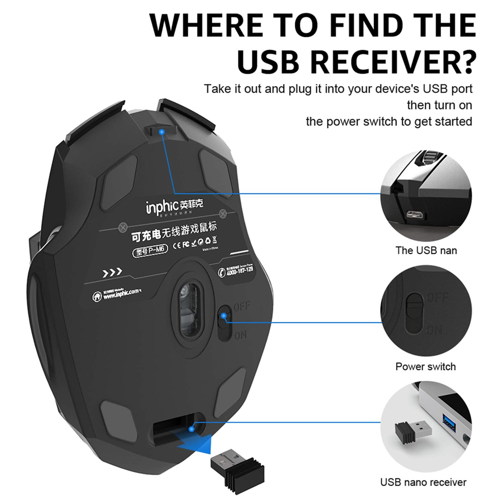 1) Перезаряжаемая беспроводная мышь. Встроенный Высококачественный аккумулятор емкостью 500 мАч. Когда вы оставляете мышь более чем на 5 минут, она автоматически переходит в спящий режим, который экономит электроэнергию мыши, и нажимает любую кнопку, чтобы снова разбудить мышь (P.S. Пожалуйста, зарядите мышь на 1 час, если она новая, перед использованием)