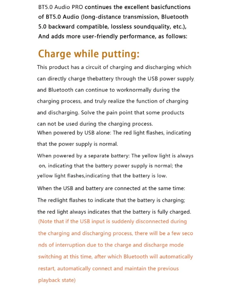 BT5.0 аудио продолжает отличные основные функции M28 (передача на дальние расстояния, обратная совместимость 5,0, качество звука без потерь и т. д.) и добавляет более удобную для пользователя производительность, следующим образом: зарядка во время установки: Этот продукт имеет цепь зарядки и разрядки, которая может непосредственно заряжать аккумулятор через источник питания USB, И может продолжать нормально работать во время процесса зарядки и действительно реализовывать функцию зарядки и разрядки. Решить болевую точку, что некоторые продукты не могут быть использованы во время процесса зарядки. Питание только от USB: мигает красный светильник, что указывает на то, что источник питания является нормальным. При питании от отдельной батареи: всегда горит желтый светильник, что указывает на то, что источник питания батареи нормальный; Мигает желтый светильник, что указывает на низкий уровень заряда батареи. Когда USB и аккумулятор подключены одновременно: Красный светильник мигает, чтобы указать, что аккумулятор заряжается; Красный светильник всегда указывает, что аккумулятор полностью заряжен. (Обратите внимание, что если вход USB неожиданно отключен во время процесса зарядки и разрядки, будет несколько секунд перерыва из-за
