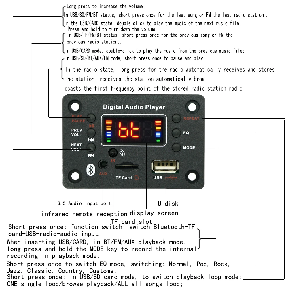 Введение в вспомогательные функции: поддержка MP3/USB/TF/LINE IN/FM/BLUETOOTH/подключение дистанционного управления/12 В постоянного тока