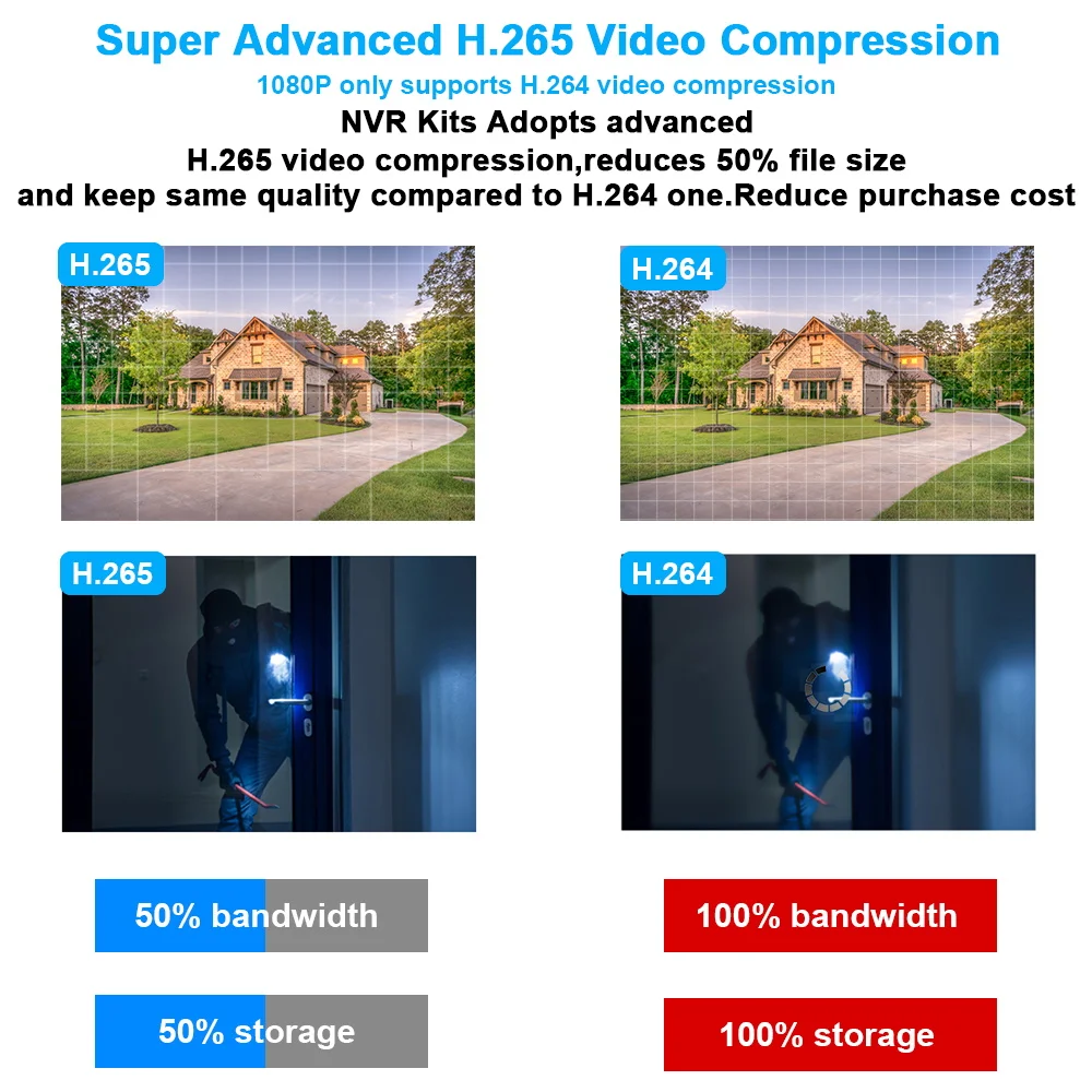 H.265 Более четкое разрешение HD обеспечивает наилучшее качество изображения при более низкой скорости передачи данных, экономя место для хранения.