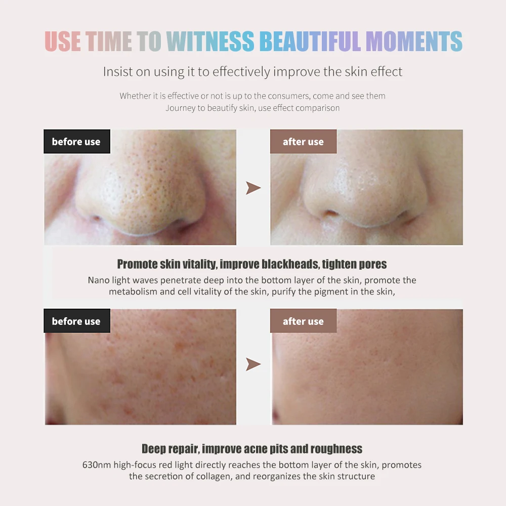 2. Вы не увидите эффект сразу, потребуется некоторое время, чтобы восстановить вашу кожу, поэтому, пожалуйста, продолжайте использовать и терпеливо подождите (если вы хотите получить лучший эффект маски, рекомендуется также использовать профессиональные средства по уходу за кожей. Светодиодные фонари будут способствовать впитыванию средств по уходу за кожей и повысят эффективность средств по уходу за кожей, тогда эффект будет лучше)
