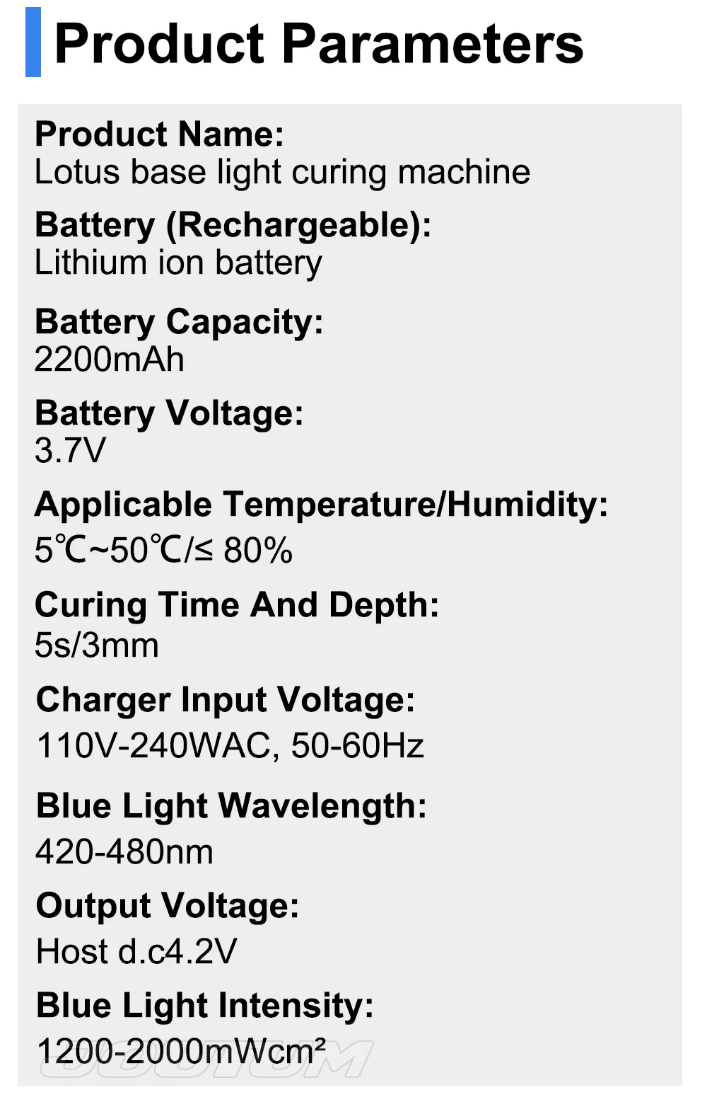 1. Свет приведенный леча мачинеадопте светоизлучающие диоды сине-луч, оно отменяет смолу с длиной волны 420-480нм, и было использовано к
