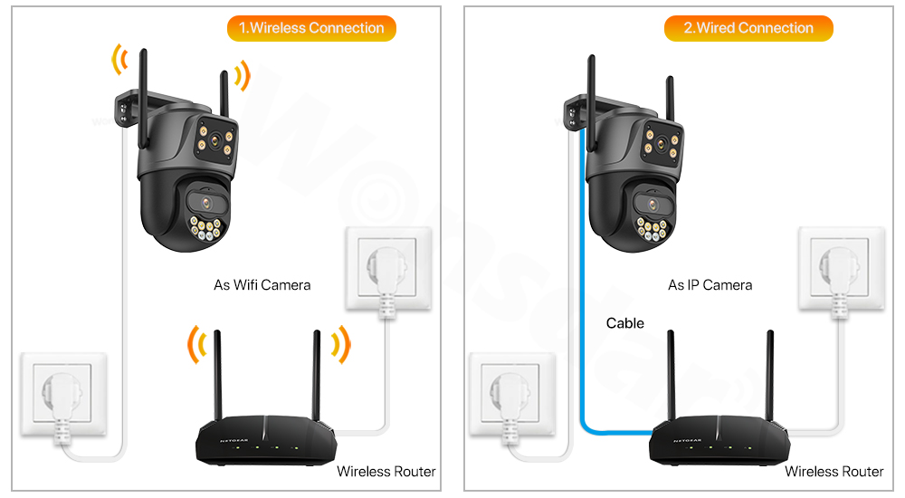 -Вы можете выбрать удобное соединение по своему усмотрению. Иногда у вас может быть только один способ подключения камеры, не волнуйтесь, эта камера поддерживает беспроводное и проводное соединение одновременно.