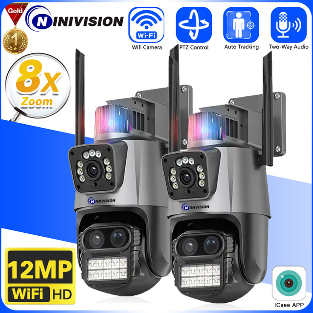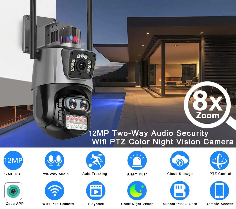 12MP беспроводная наружная безопасность три объектива 8X PTZ зум светильник Сигнализация 4K видеонаблюдение Wi-Fi IP PTZ CCTV сеть ICsee XM камера