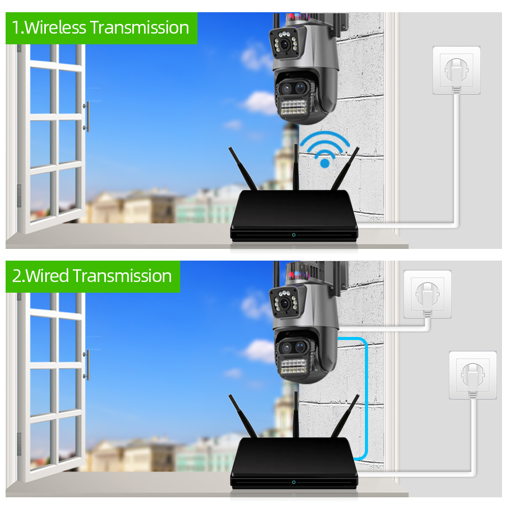 Питание от адаптера DC12V, вы можете подключить камеру к сети Wi-Fi. Вы можете настроить Wi-Fi-соединение камеры или поиск по локальной сети с помощью сетевого кабеля, подключенного к маршрутизатору, работать только с 2,4G Wi-Fi (не поддерживает 5G).